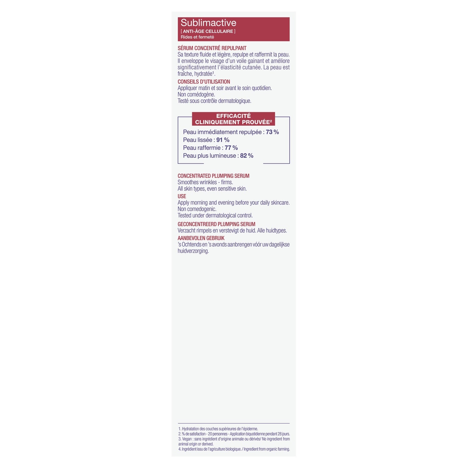 Sublimactive® Concentrated Plumping Serum glättet Fältchen und strafft die Haut. Es verbessert die Hautelastizität deutlich. Die Haut wirkt frisch. Nicht komedogen. Dermatologisch getestet.
