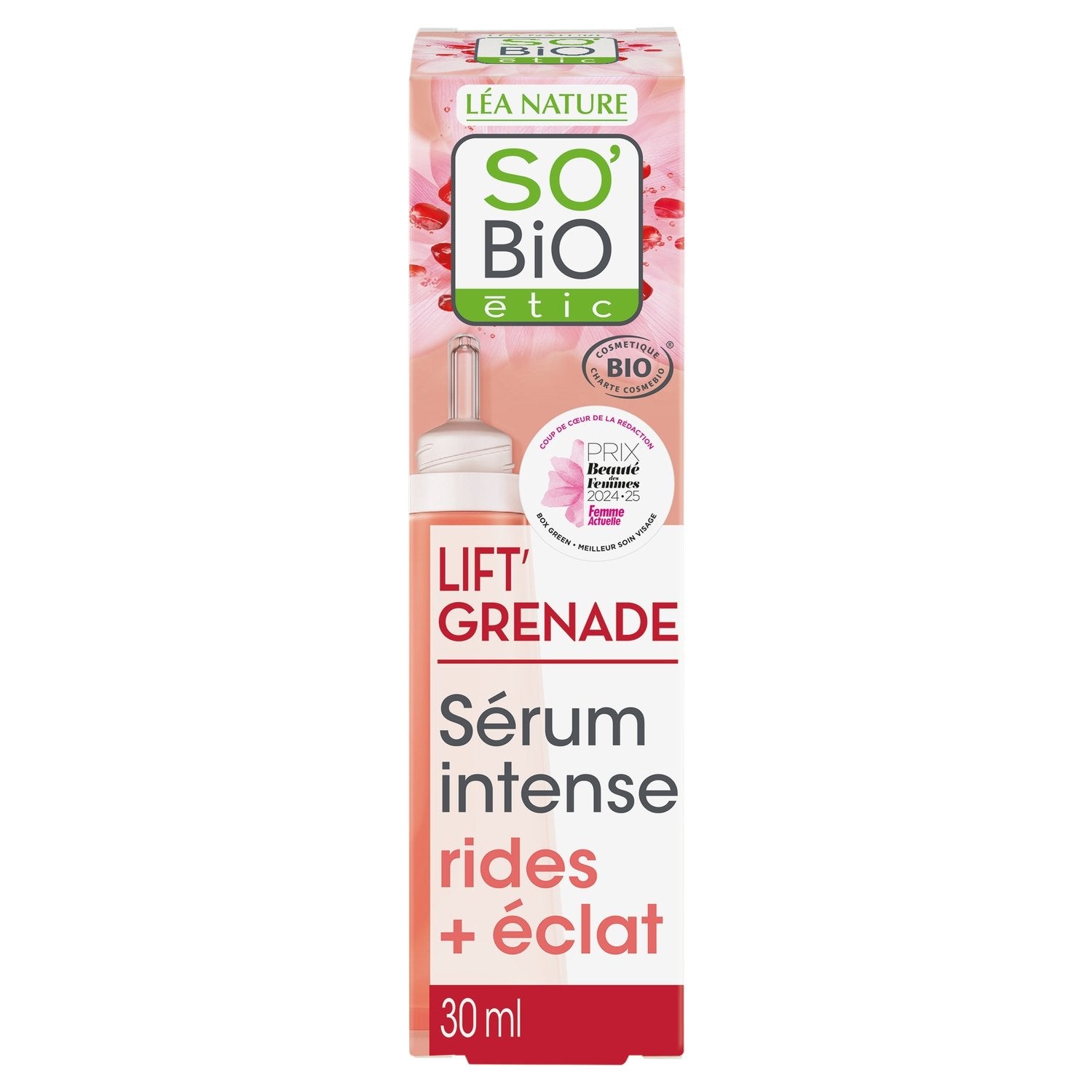 Dieses Serum mit doppelter Wirkstoffkonzentration wirkt intensiv auf Ihre Haut und macht sie glatter und strahlender. Fältchen werden sichtbar reduziert. Für Frauen auf der Suche nach Wirksamkeit und Vergnügen: 2x mehr französischer Bio-Granatapfel mit antioxidativen Eigenschaften und pflanzliches Retinol-ähnliches Material mit einer Wirksamkeit gegen Fältchen, die mit synthetischem Retinol vergleichbar ist, aber sanfter zur Haut, vereint in einer leicht glitzernden, innovativen und technischen Textur. Sein spritziger und prickelnder Duft bekämpft den Kollagenabbau. NACHWEISBARE ERGEBNISSE AB 30 MIN³: FALTEN -12 % Anzahl -13 % Dauer AB 28 TAGEN: 86 % FALTEN sind reduziert4 +22 % Ausstrahlung5 1. Im Vergleich zu anderen Produkten der Reihe. 2. Volumen und Tiefe. 3. Gemessene Wirksamkeit & 4. % Zufriedenheit & 5. klinische Bewertung – 21 Frauen. NACHGEWIESENE ERGEBNISSE AB 30 MIN³: FALTEN -12 % Anzahl -13 % Dauer AB 28 TAGEN: 86 % FALTEN reduziert4 +22 % Ausstrahlung5 3. Gemessene Wirksamkeit & 4. % Zufriedenheit & 5. Klinische Bewertung – 21 Frauen. COSMOS ORGANIC-zertifiziert durch ECOCERT Greenlife. 99 % natürlichen Ursprungs. 0 % Silikon, Mineralöl und synthetische Farbstoffe. + ETHISCH: - Französischer Bio-Sektor: SO'BIO étic hat einen handgepflückten französischen Bio-Granatapfel von einem Familienbetrieb ausgewählt. Mit seinem Kauf unterstützen Sie einen lokalen Erzeuger. - Ökodesign - Hergestellt in Frankreich - 1 % für den Planeten