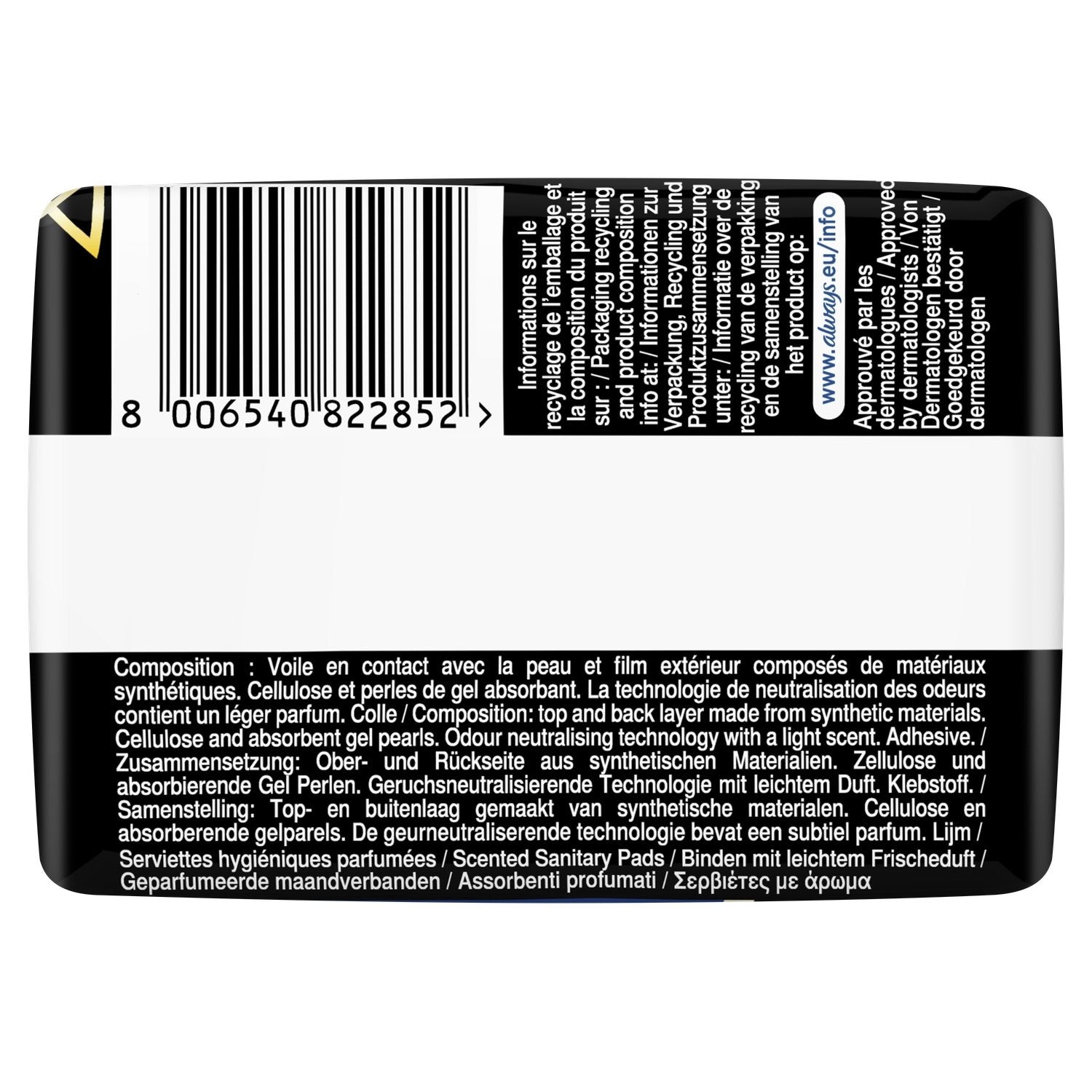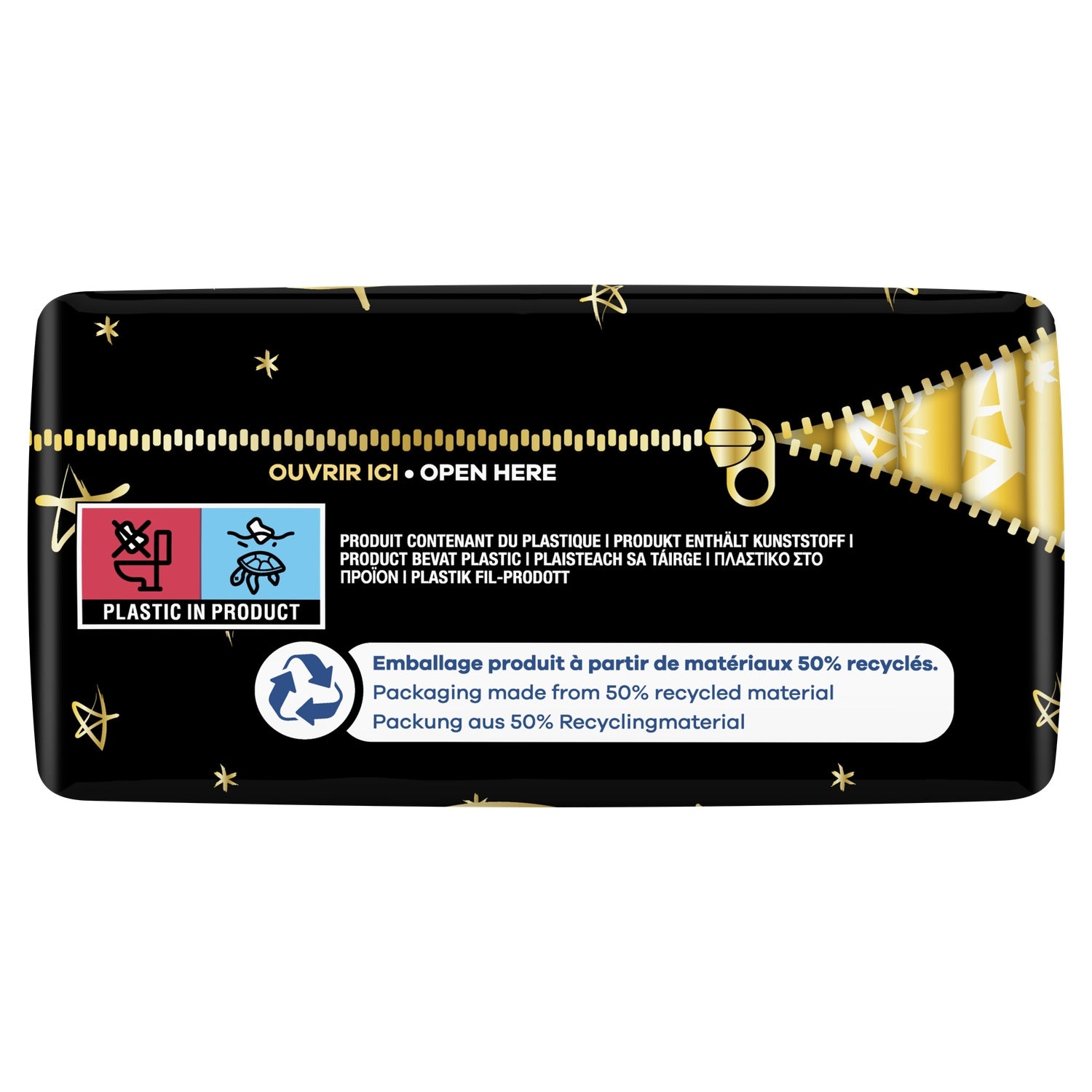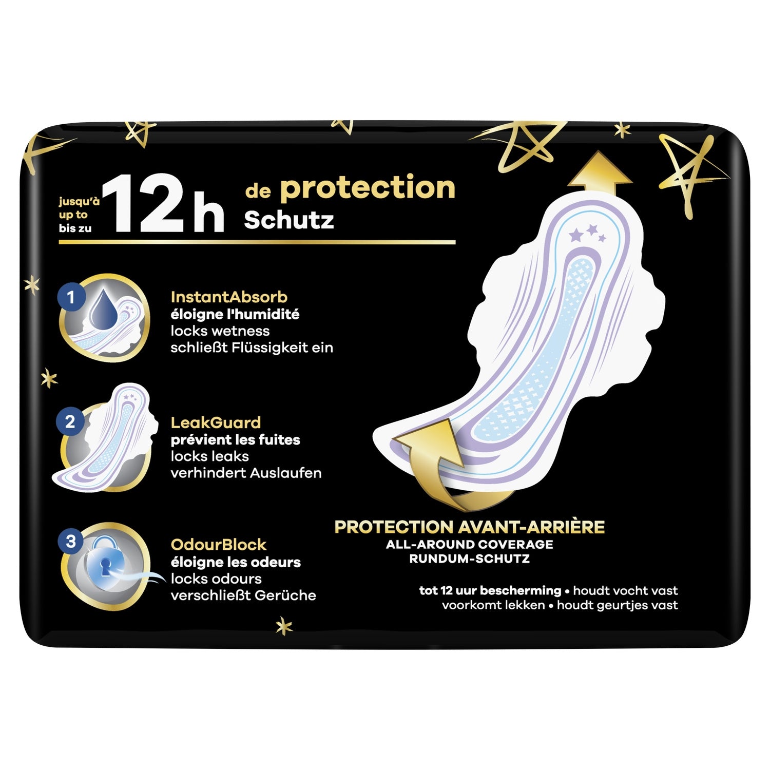 9 % breitere Vorderseite und 85 % breitere Rückseite als Ultra Normal (Größe 1) für verbesserten Schutz über Nacht. Die Anti-Leak-Technologie schließt Flüssigkeit ein und hilft, Auslaufen zu verhindern. Saugfähige, weiche Oberschicht. Die OdourBlock-Technologie neutralisiert Gerüche. Dank InstantAbsorb saugt die Binde Flüssigkeit in Sekunden auf. Die Außenverpackung besteht zu 50 % aus recyceltem Kunststoff. Von Dermatologen der Skin Health Alliance zugelassen