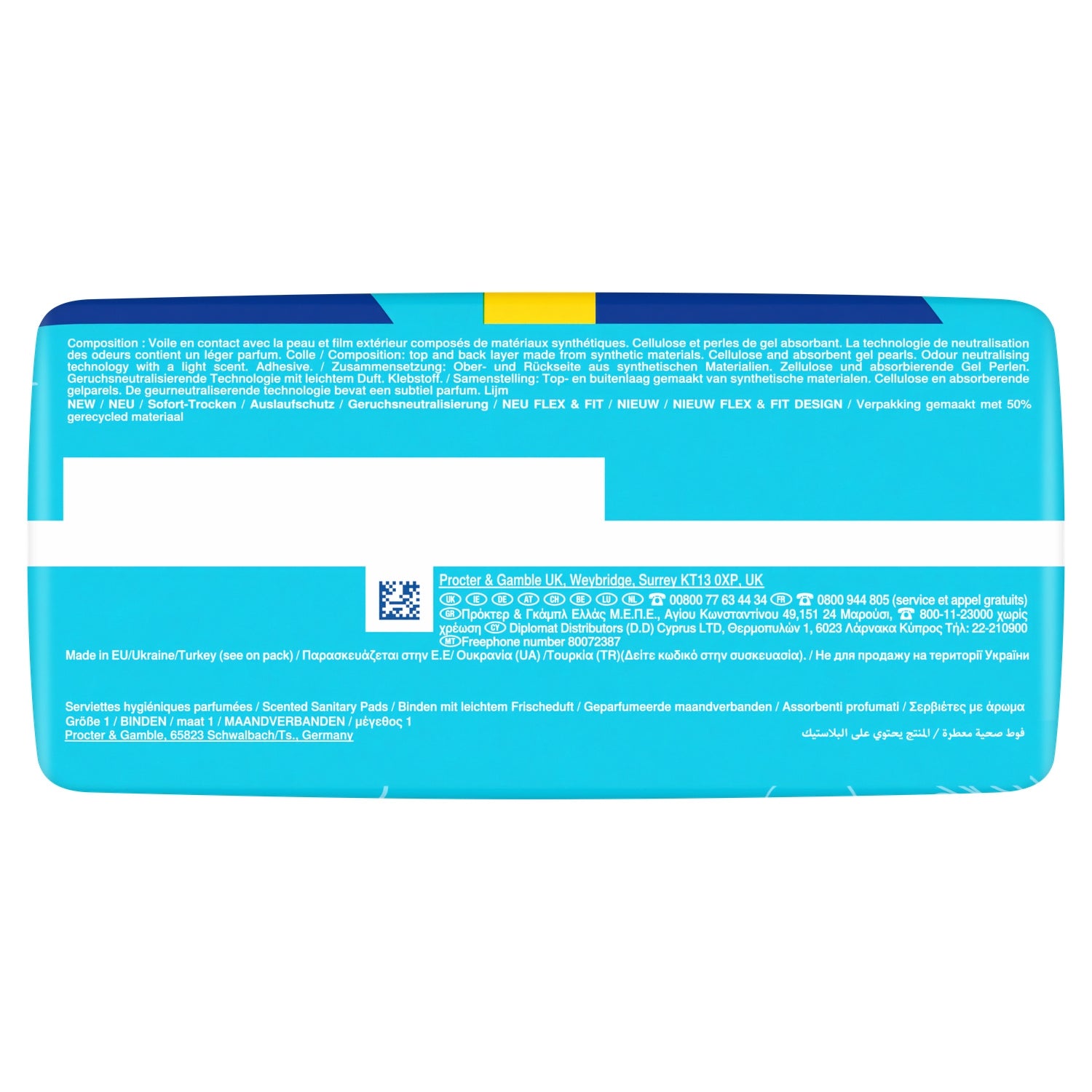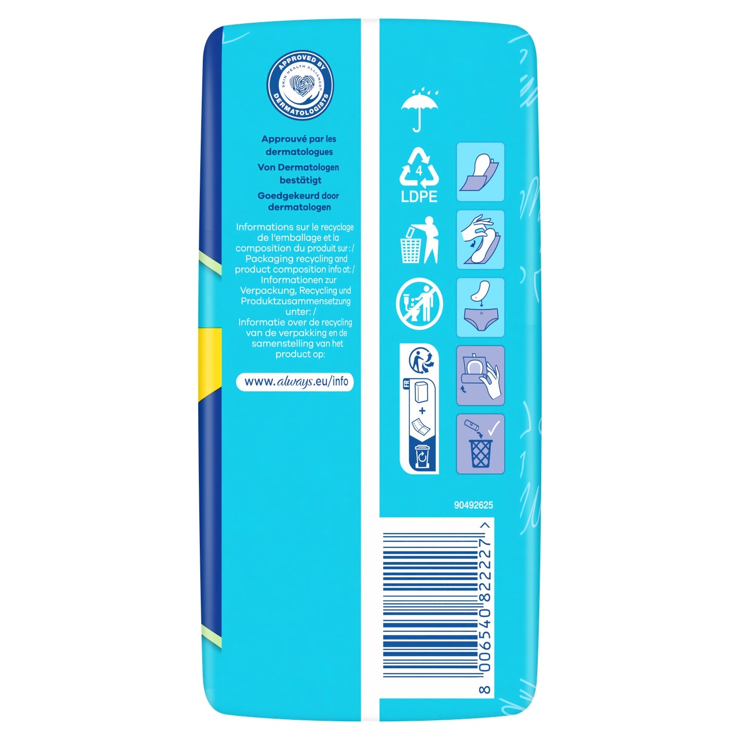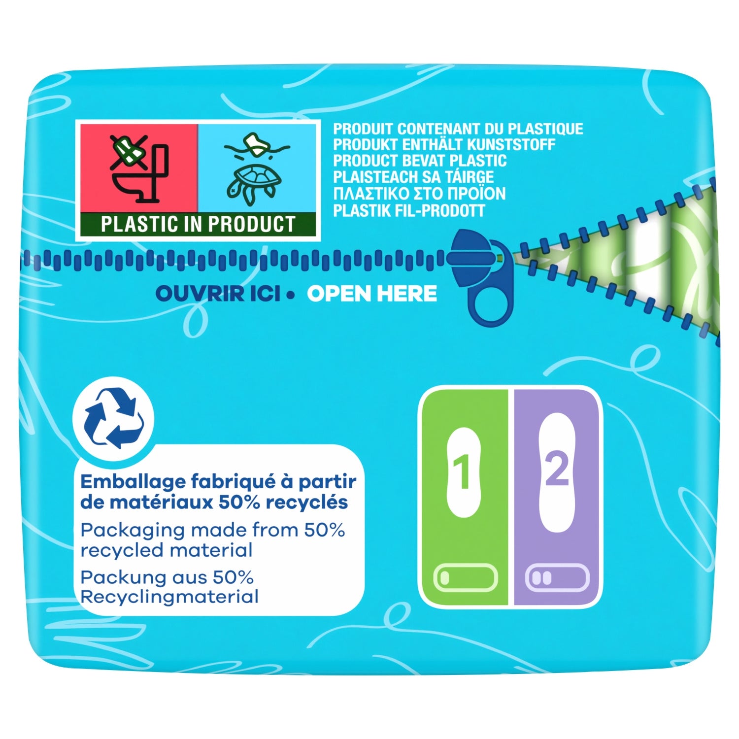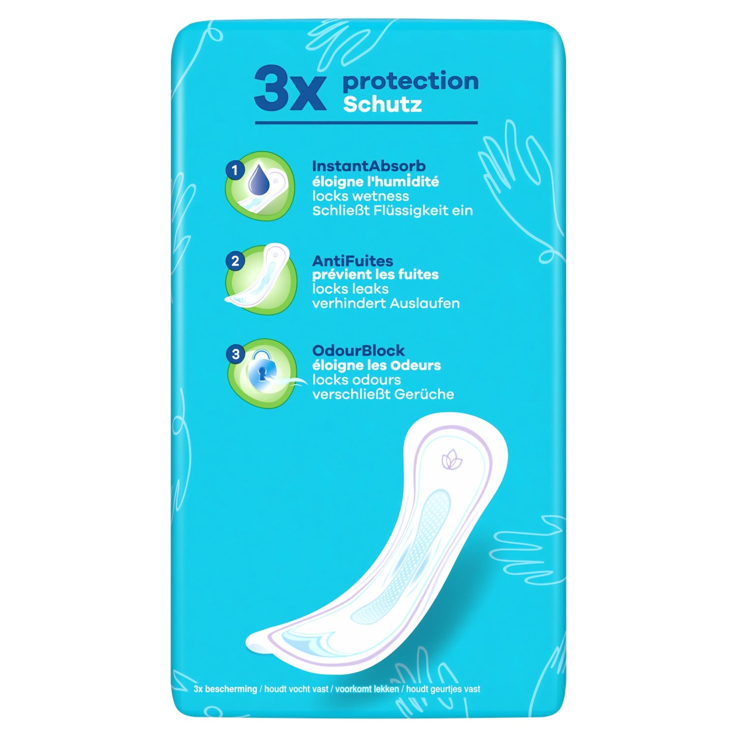 Dreifacher Schutz für ein frisches und trockenes Gefühl während der Periode. Dank InstantAbsorb saugt die Binde Flüssigkeit in Sekunden auf. Die Anti-Leak-Technologie schließt Flüssigkeit ein und hilft, Auslaufen zu verhindern. Saugfähige, weiche Oberschicht. Die OdourBlock-Technologie neutralisiert Gerüche. Die Außenverpackung besteht zu 50 % aus recyceltem Kunststoff. Von Dermatologen der Skin Health Alliance zugelassen
