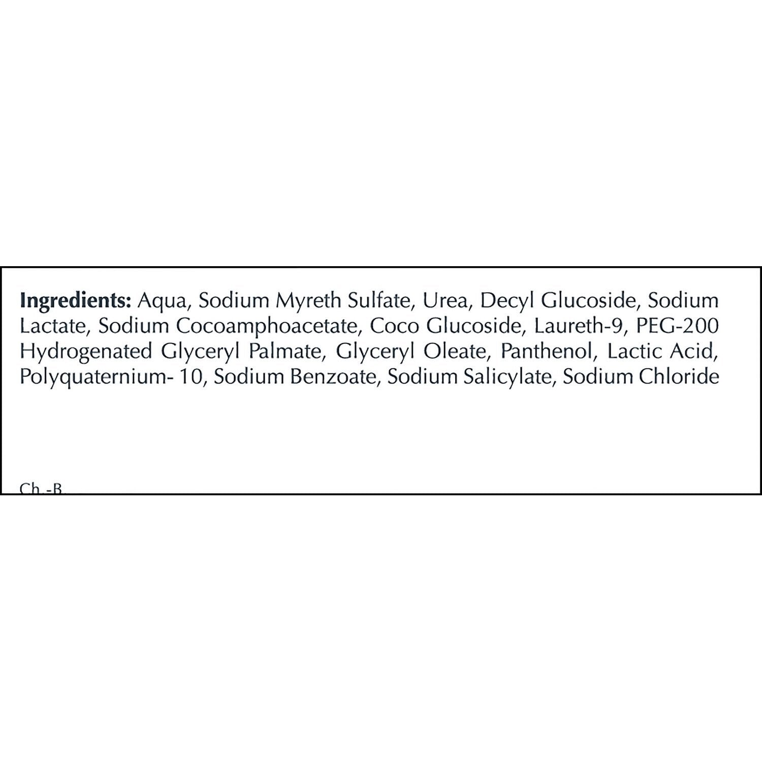 Aqua, Natriummyrethsulfat, Harnstoff, Decylglucosid, Natriumlactat, Natriumcocoamphoacetat, Cocoglucosid, Laureth-9, PEG-200 hydriertes Glycerylpalmat, Glyceryloleat, Panthenol, Milchsäure, Polyquaternium-10, Natriumbenzoat, Natriumsalicylat, Natriumchlorid.