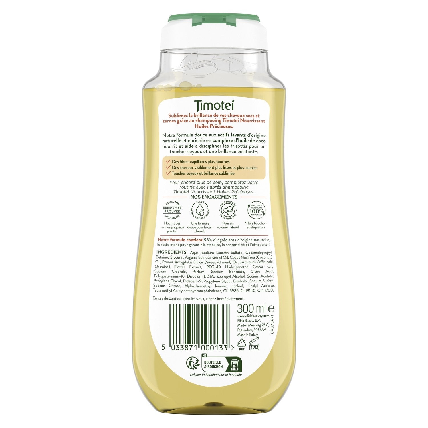Entdecken Sie das Timotei Nourishing Precious Oils Shampoo mit Argan- und Jasminöl für trockenes und stumpfes Haar.,Dieses mit Kokosnussölkomplex angereicherte Shampoo pflegt Ihr Haar und hilft, Frizz zu bändigen.,Die dermatologisch getestete Formel des Timotei Nourishing Precious Oils Shampoo enthält 95 % Inhaltsstoffe natürlichen Ursprungs.,Ein silikonfreies Shampoo für natürliches Volumen.,Enthält pflanzliche Reinigungsmittel für eine sanfte Haarpflege, aus der Natur gewonnen und mit Kokosnussölkomplex angereichert.,Unsere Flaschen bestehen aus 100 % recyceltem Kunststoff* und sind für einfaches Recycling transparent. *Ohne Deckel und Etiketten.