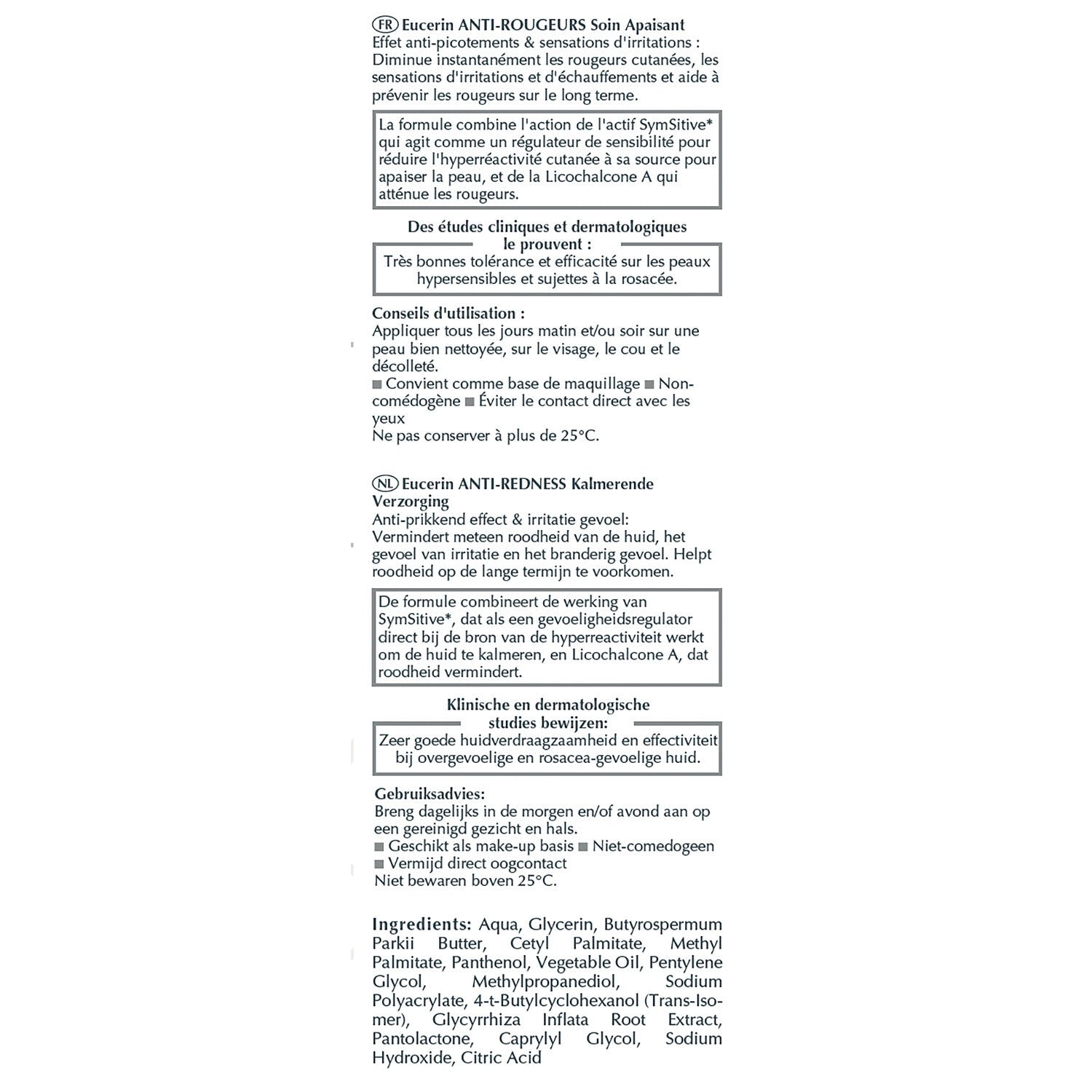 Eucerin Anti-Rötung Beruhigende Pflege Anti-Kribbeln & Reizgefühle Wirkung: Reduziert sofort Hautrötungen, Reizungen und Hitzegefühle und hilft, Rötungen langfristig vorzubeugen. Die Formel kombiniert die Wirkung des Wirkstoffs SymSitive (eingetragenes Warenzeichen Symrise AG), der als Empfindlichkeitsregulator wirkt, um die Überempfindlichkeit der Haut an ihrer Quelle zu reduzieren und die Haut zu beruhigen, und Licochalcon A, das Rötungen reduziert. Klinische und dermatologische Studien belegen: Sehr gute Verträglichkeit und Wirksamkeit bei überempfindlicher und zu Rosazea neigender Haut. Anwendung: Täglich morgens und/oder abends auf die gut gereinigte Haut im Gesicht, am Hals und am Dekolleté auftragen. Geeignet als Make-up-Grundlage.