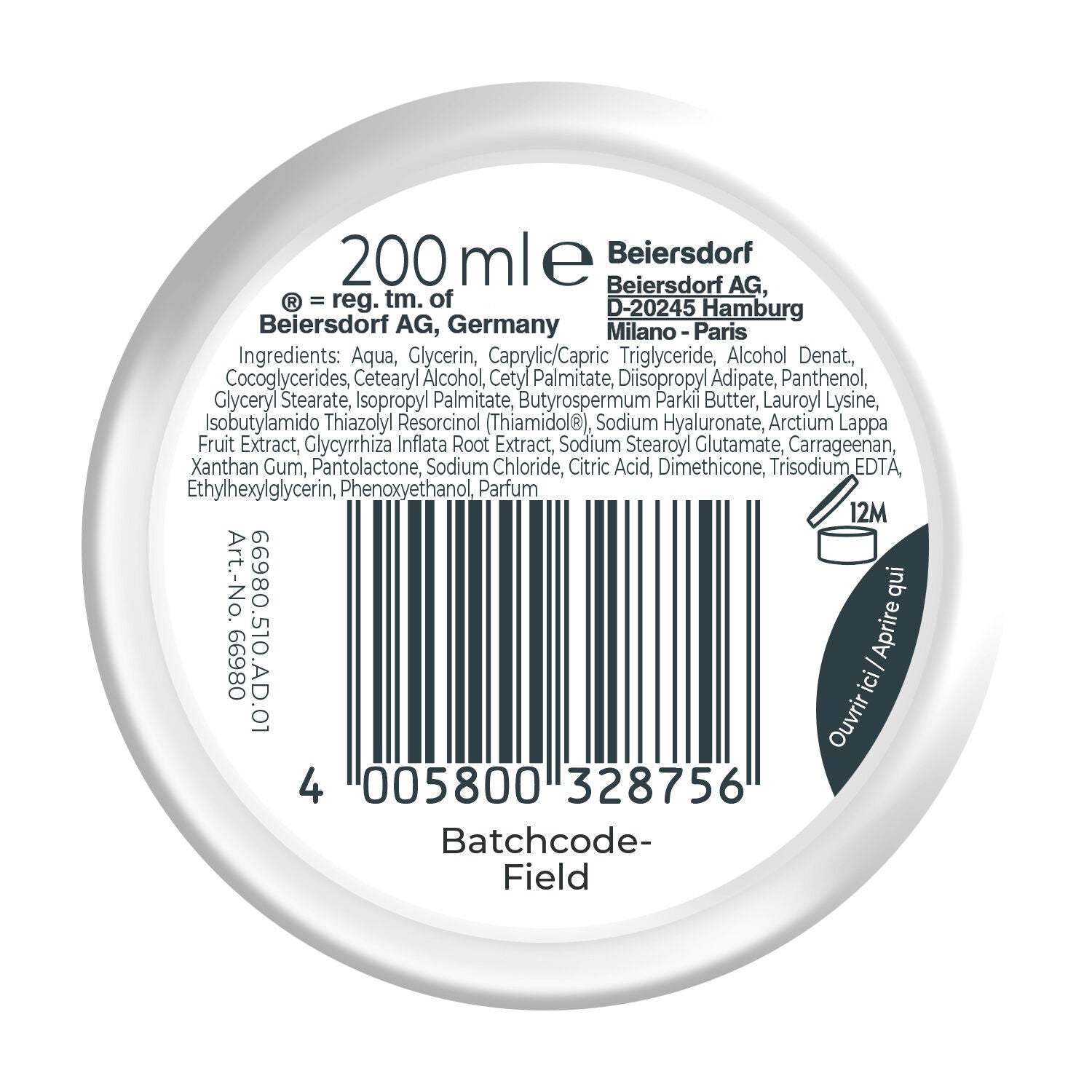 Aqua, Glycerin, Capryl-/Caprin-Triglycerid, denat. Alkohol, Cocoglyceride, Cetearylalkohol, Cetylpalmitat, Diisopropyladipat, Panthenol, Glycerylstearat, Isopropylpalmitat, Butyrospermum Parkii-Butter, Lauroyllysin, Isobutylamido-Thiazolylresorcin (Thiamidol®), Natriumhyaluronat, Arctium-Lappa-Fruchtextrakt, Glycyrrhiza-Inflata-Wurzelextrakt, Natriumstearoylglutamat, Carrageen…