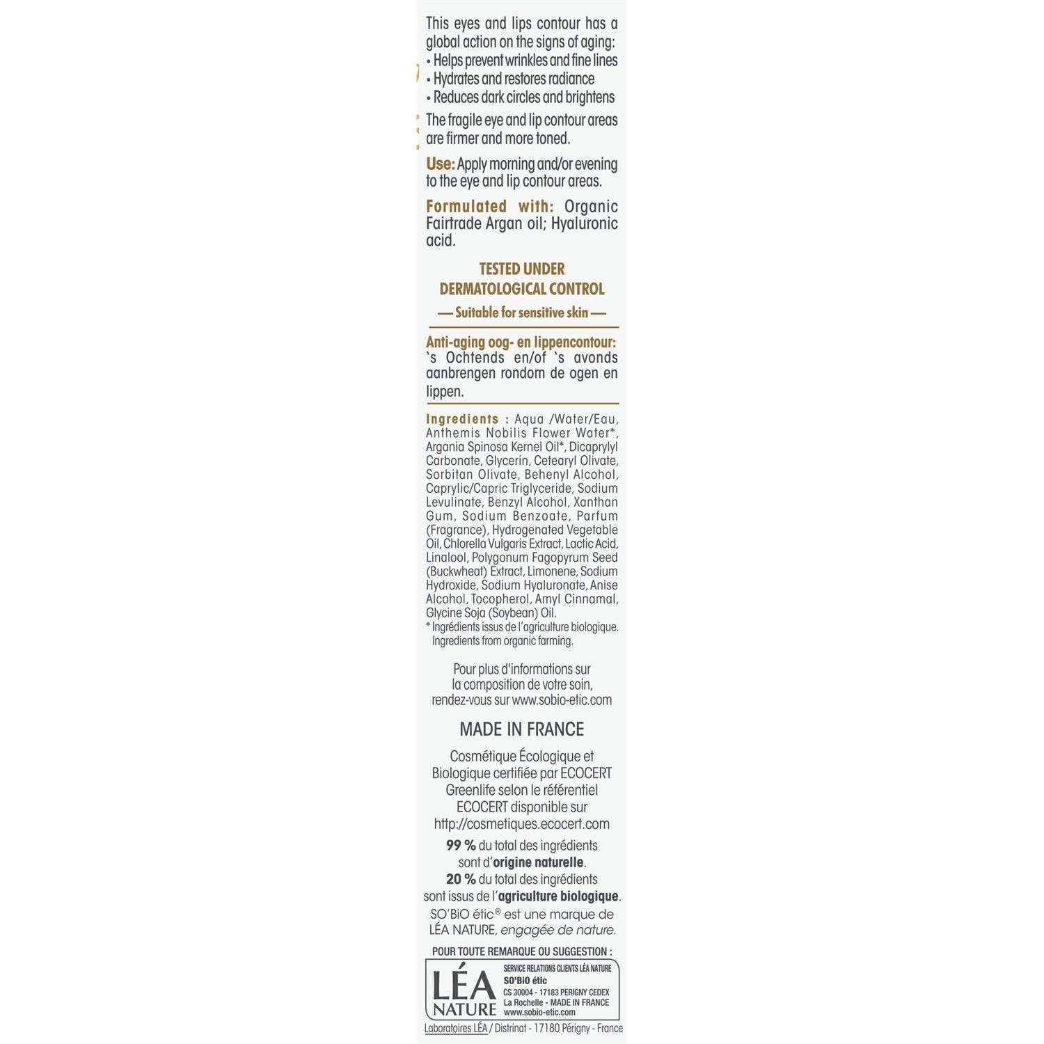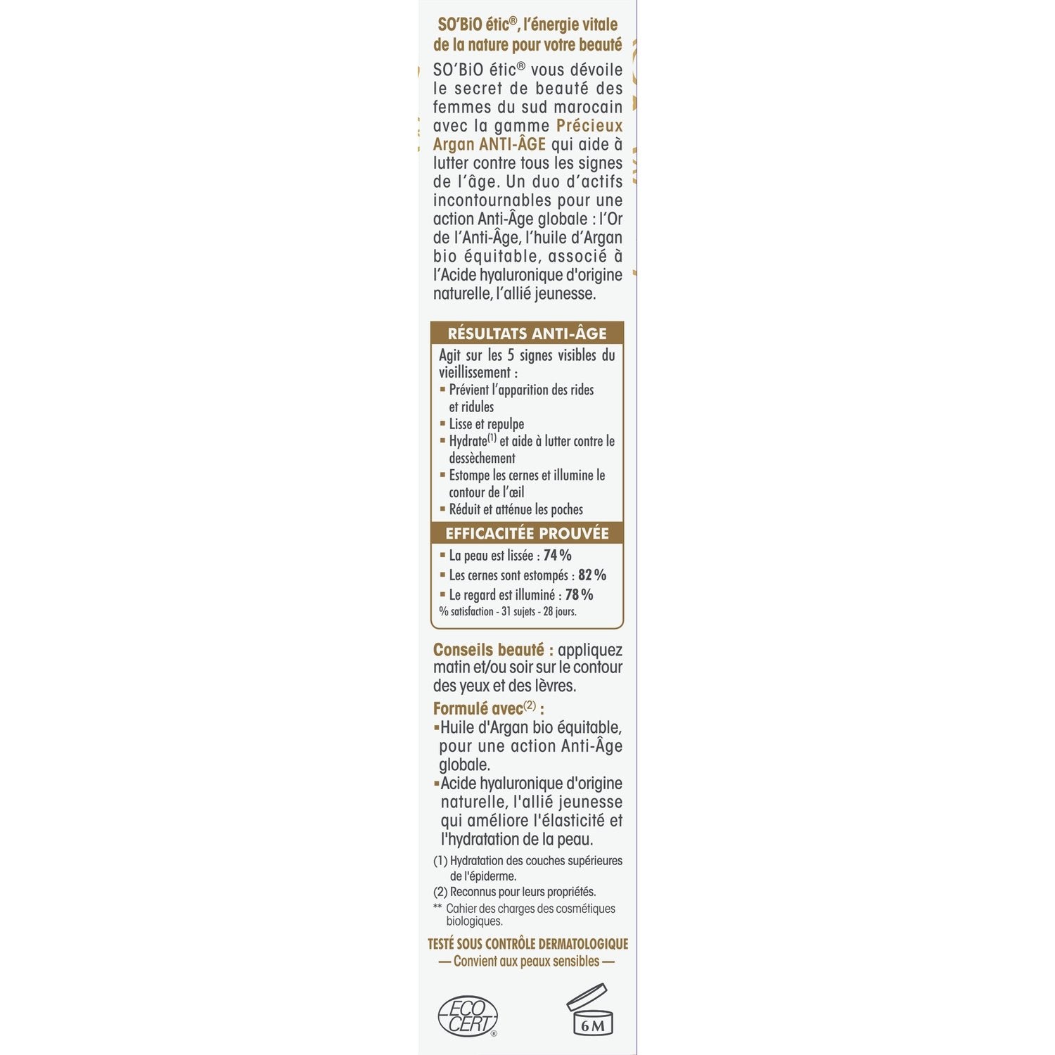 Diese Anti-Aging-Pflege für Augen und Lippen wirkt dank eines Duos essentieller Wirkstoffe umfassend auf die 5 sichtbaren Zeichen der Hautalterung: Bio-Arganöl aus fairem Handel kombiniert mit Hyaluronsäure natürlichen Ursprungs. Sie spendet Feuchtigkeit, lässt die Haut um die Augen erstrahlen und polstert sie auf. Sie glättet Fältchen und feine Linien, beugt ihrer Entstehung vor und reduziert Schwellungen. NACHGEWIESENE ERGEBNISSE: - Fältchen und feine Linien werden geglättet: +10 %¹ - Schwellungen werden reduziert: +26 %¹ - Die Haut wird mit Feuchtigkeit versorgt: 100 %² 1. Selbsteinschätzung – 22 Frauen – 28 Tage. 2. % Zufriedenheit – 22 Frauen – sofortige Ergebnisse.