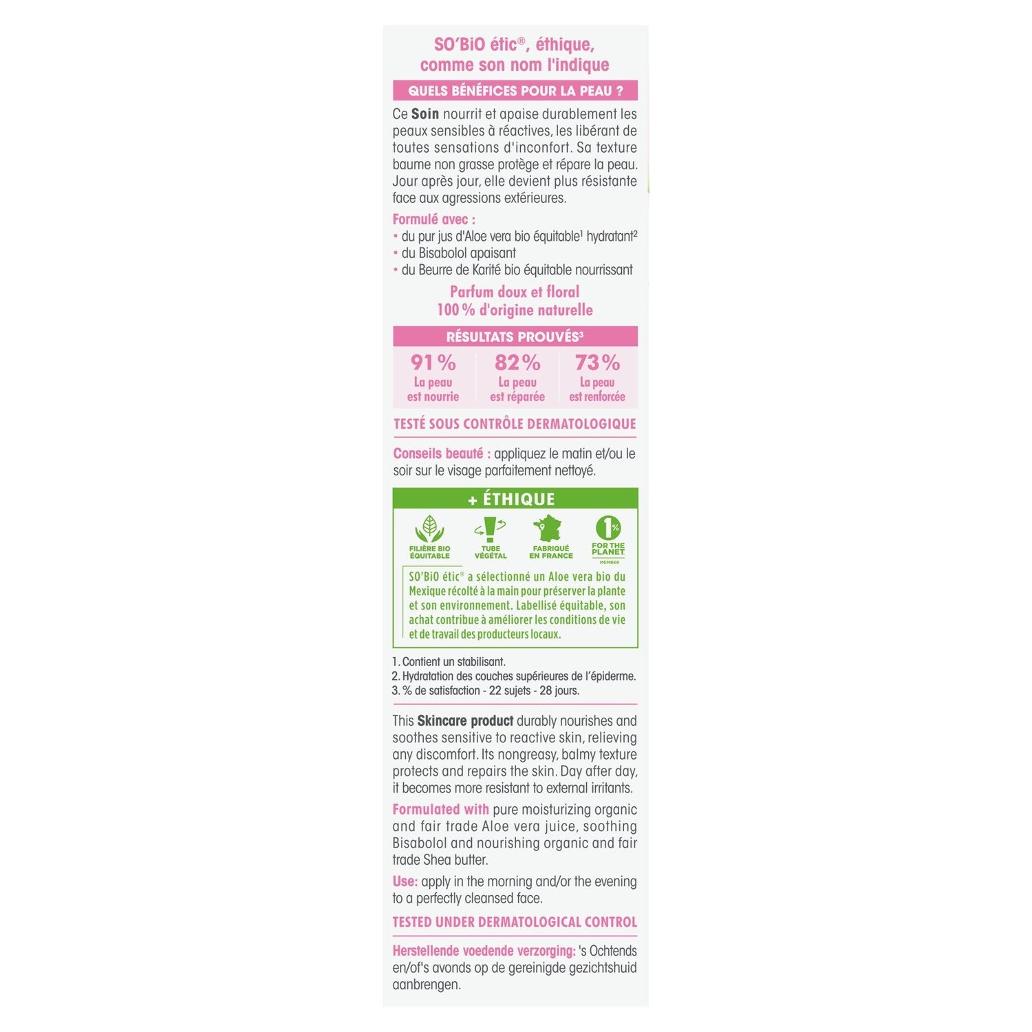 Die nährende und reparierende Pflege nährt und beruhigt empfindliche bis reaktive Haut langanhaltend und befreit sie von jeglichem Unwohlsein. Ihre nicht fettende Balsamtextur schützt und repariert die Haut. Tag für Tag wird sie widerstandsfähiger gegen äußere Einflüsse. Formuliert mit reinem, feuchtigkeitsspendendem Aloe-Vera-Saft aus fairem Handel, beruhigendem Bisabolol und nährender, fair gehandelter Bio-Sheabutter. Nachgewiesene Ergebnisse: - Haut wird genährt: 91 % - Haut wird repariert: 82 % - Haut wird gestärkt: 73 % % Zufriedenheit - 22 Probanden - 28 Tage. COSMOS ORGANIC-zertifiziert von ECOCERT Greenlife gemäß dem COSMOS-Standard. 99 % natürlichen Ursprungs. 0 % Silikon, Mineralöl, synthetische Duftstoffe. + ETHISCH - Fair-Trade-Bio-Sektor: SO'BiO étic hat Bio-Aloe Vera aus Mexiko ausgewählt, die von Hand geerntet wird, um die Pflanze und ihre Umwelt zu schützen. Fairtrade-zertifiziert, trägt der Kauf dazu bei, die Lebens- und Arbeitsbedingungen der lokalen Produzenten zu verbessern. - Gemüsetube - Hergestellt in Frankreich - 1 % für den Planeten