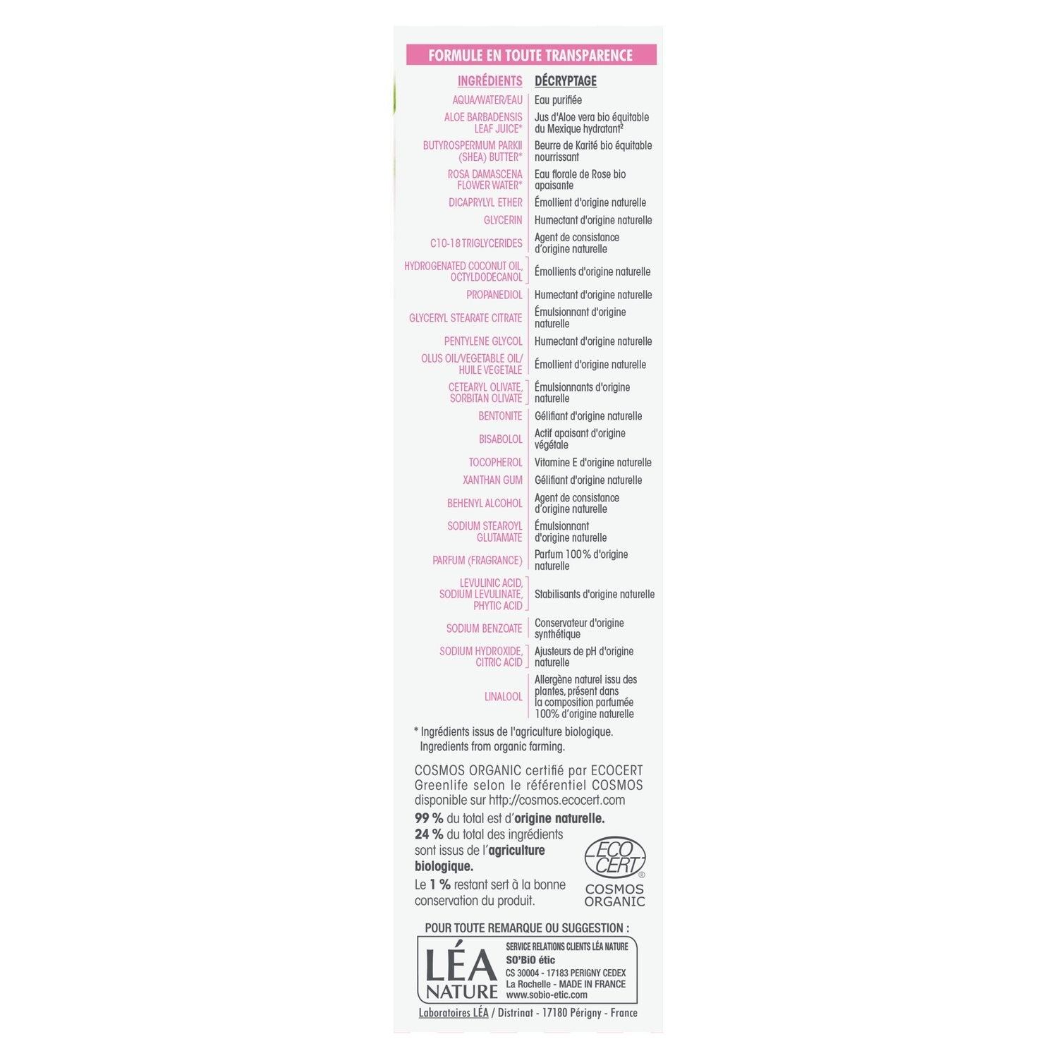 Inhaltsstoffe: AQUA/WATER/EAU, ALOE BARBADENSIS LEAF JUICE*, BUTYROSPERMUM PARKII (SHEA) BUTTER*, ROSA DAMASCENA FLOWER WATER*, DICAPRYLYL ETHER, GLYCERIN, C10-18 TRIGLYCERIDE, HYDROGENATED COCONUT OIL, OCTYLDODECANOL, PROPANEDIOL, GLYCERYL STEARATE CITRATE, PENTYLENE GLYCOL, OLUS OIL/VEGETABLE OIL/HUILE VEGETALE, CETEARYL OLIVATE, SORBITAN OLIVATE, BENTONITE, BISABOLOL, TOCOPHEROL, SODIUM LEVULINATE, PHYTIC ACID, SODIUM BENZOATE, SODIUM HYDROXIDE, CITRIC ACID, LINALOOL. *Inhaltsstoffe aus biologischem Anbau. Inhaltsstoffe aus biologischem Anbau.