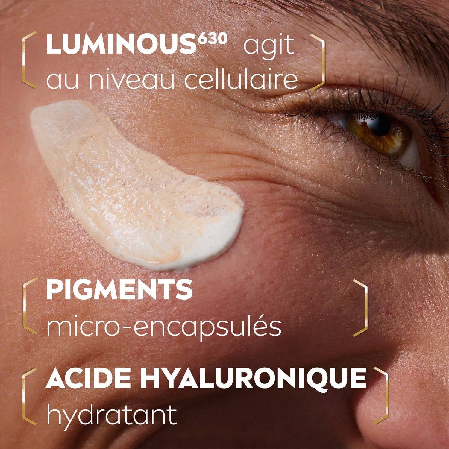 LUMINOUS630® ANTI-DARK SPOT CC FLUID SPF 30 COMPLEXION PERFECTOR hat eine dreifache Wirkung: 1. ABDECKUNG: Die Pigmente sorgen für eine natürliche Abdeckung, um Flecken und Unreinheiten auszugleichen. 2. REDUZIERT: Die leichte Formel mit LUMINOUS630® reduziert die Intensität dunkler Flecken ab 2 Wochen (Selbstbewertung, 50 Frauen) und verbessert die Gleichmäßigkeit des Hauttons in 8 Wochen um 40 %*. 3. SCHÜTZT: Die Formel enthält LSF 30, der die Haut vor UV-Strahlen schützt und der Entstehung neuer Flecken vorbeugt.