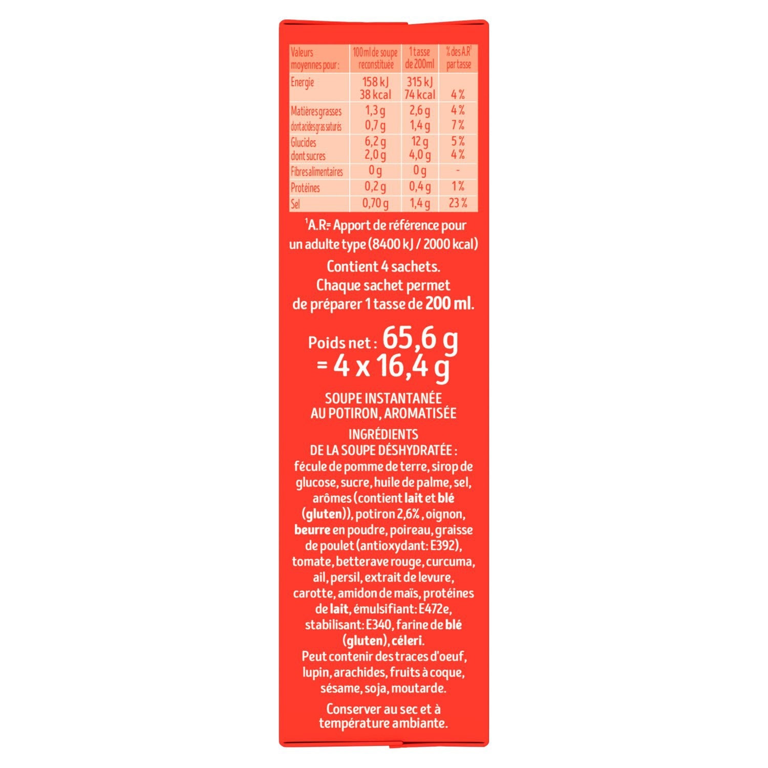 Zutaten der getrockneten Suppe: Kartoffelstärke, Glukosesirup, Zucker, Palmöl, Salz, Aromen (enthält MILCH und WEIZEN (GLUTEN)), Kürbis 2,6 %, Zwiebel, BUTTERpulver, Lauch, Hühnerfett (Antioxidationsmittel: E392), Tomate, Rote Bete, Kurkuma, Knoblauch, Petersilie, Hefeextrakt, Karotte, Maisstärke, MILCHEIWEIß, Emulgator: E472e, Stabilisator: E340, WEIZENMEHL (GLUTEN), SELLERIE. Kann Spuren von EI, Lupine, ERDNÜSSEN, NÜSSEN, SESAM, SOJA und SENF enthalten.