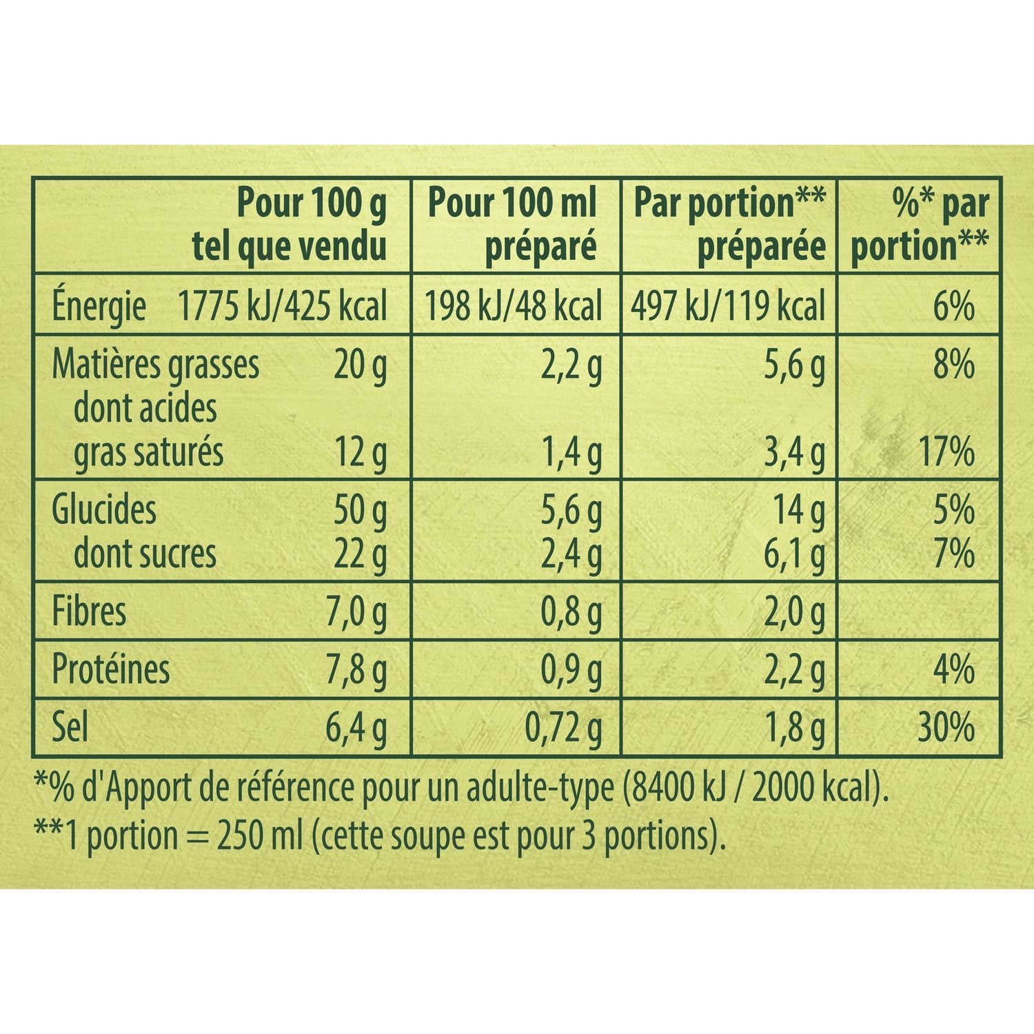 Zutaten: Kartoffeln¹: 17%, Palmfett, Zucker, WEIZENmehl, Kürbis¹: 6,7%, Karotten¹: 6,4%, Kartoffelstärke, Salz, SAHNE: 4,9%, grüne Bohnen¹: 4,5%, Tomaten¹: 4,5%, BUTTER, Zwiebeln¹: 2,9%, hydrolysiertes Pflanzenprotein, Hühnerfett (Hühnerfett, Antioxidationsmittel: Rosmarinextrakt), Laktose (MILCH), SELLERIE¹: 1,3%, MagerMILCH, MILCHproteine, …