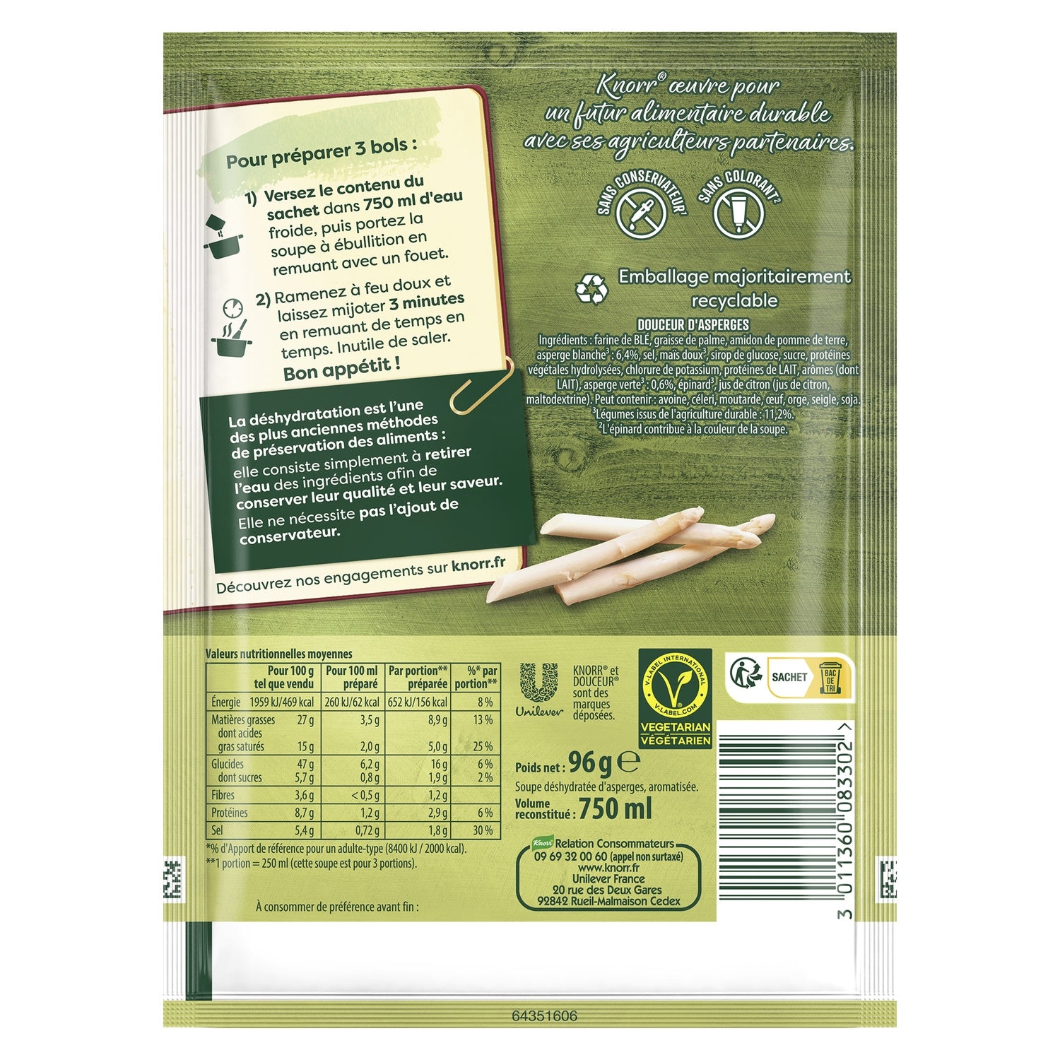 Entdecken Sie die köstliche Knorr® Spargel Softness Suppe, eine Suppe, die eine weiße Spargelvelouté mit knackigen grünen Spargelstücken kombiniert.,Der ganze gute Geschmack von Gemüse in diesen cremigen Knorr® Suppen für den Genuss von Jung und Alt.,Eine Suppe mit Spargel aus nachhaltigem Anbau, ohne Farbstoffe, Konservierungsstoffe oder Geschmacksverstärker.,Aber was ist Dehydration? Dabei wird den Zutaten unserer Suppen das Wasser entzogen, um ihre Qualität und ihren Geschmack ohne Zusatz von Konservierungsstoffen zu erhalten.,Mit dieser Zubereitungsart können Sie 3 großzügige Schüsseln Gemüsesuppe zubereiten.,Ein wohltuendes Suppenrezept, fertig in 3 Minuten: 750 ml Wasser zum Kochen bringen, Hitze reduzieren und den Inhalt des Beutels hineingeben. 3 Minuten köcheln lassen. Fertig!
