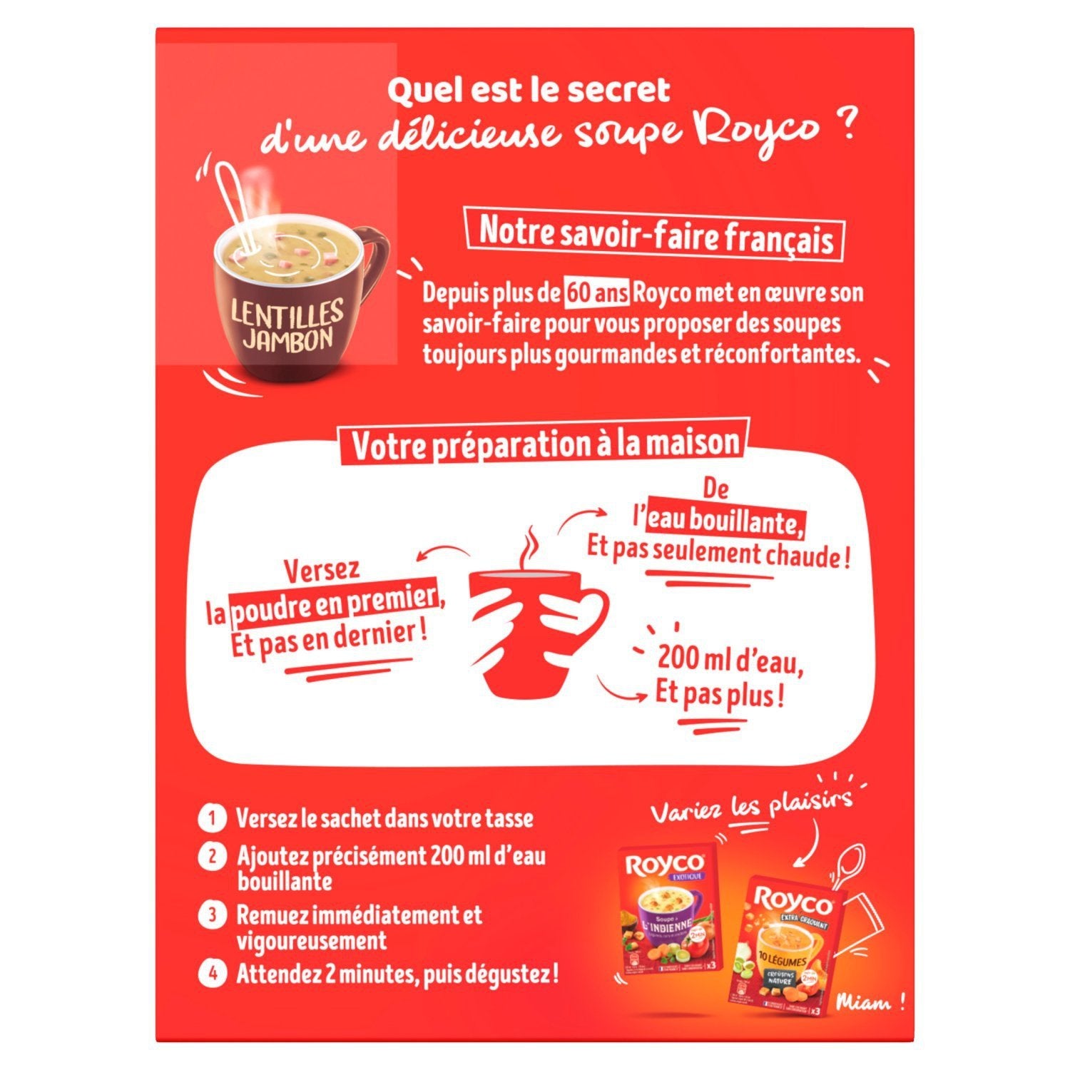Um die Qualität unserer Suppen zu bewahren, ohne Zusatz von Konservierungsstoffen**! **Wie alle Suppen in der Frischhalteabteilung. Was ist das Geheimnis einer köstlichen Royco-Suppe? Unser französisches Know-how Seit über 60 Jahren nutzt Royco sein Know-how, um Ihnen immer köstlichere und wohltuendere Suppen anzubieten. Wie stellen wir unsere Suppen her? Sorgfältig ausgewähltes Gemüse, das von unseren Produzenten reif geerntet wird, wird getrocknet und dann fein pulverisiert. Variieren Sie die Genüsse Royco Exotische indische Suppe Royco Extra knackig 10 Gemüse
