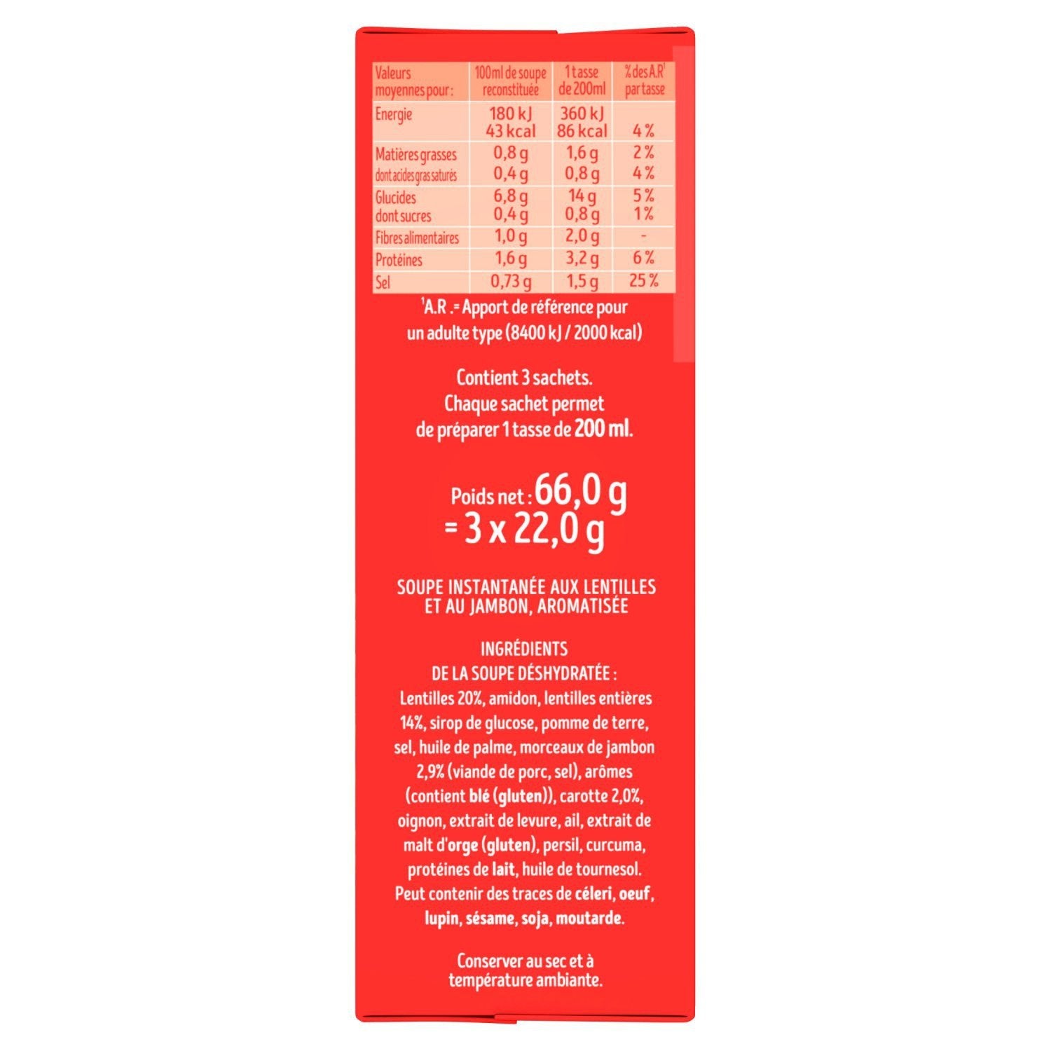 Zutaten der getrockneten Suppe: Linsen 20%, Stärke, ganze Linsen 14%, Glukosesirup, Kartoffeln, Salz, Palmöl, Schinkenstücke 2,9% (Schweinefleisch, Salz), Aromen (enthält WEIZEN (GLUTEN)), Karotten 2,0%, Zwiebeln, Hefeextrakt, Knoblauch, GERSTENMALZEXTRAKT (GLUTEN)), Petersilie, Kurkuma, MILCHPROTEINE, Sonnenblumenöl. Kann Spuren von SELLERIE, EI, Lupine, SESAM, SOJA, SENF enthalten.