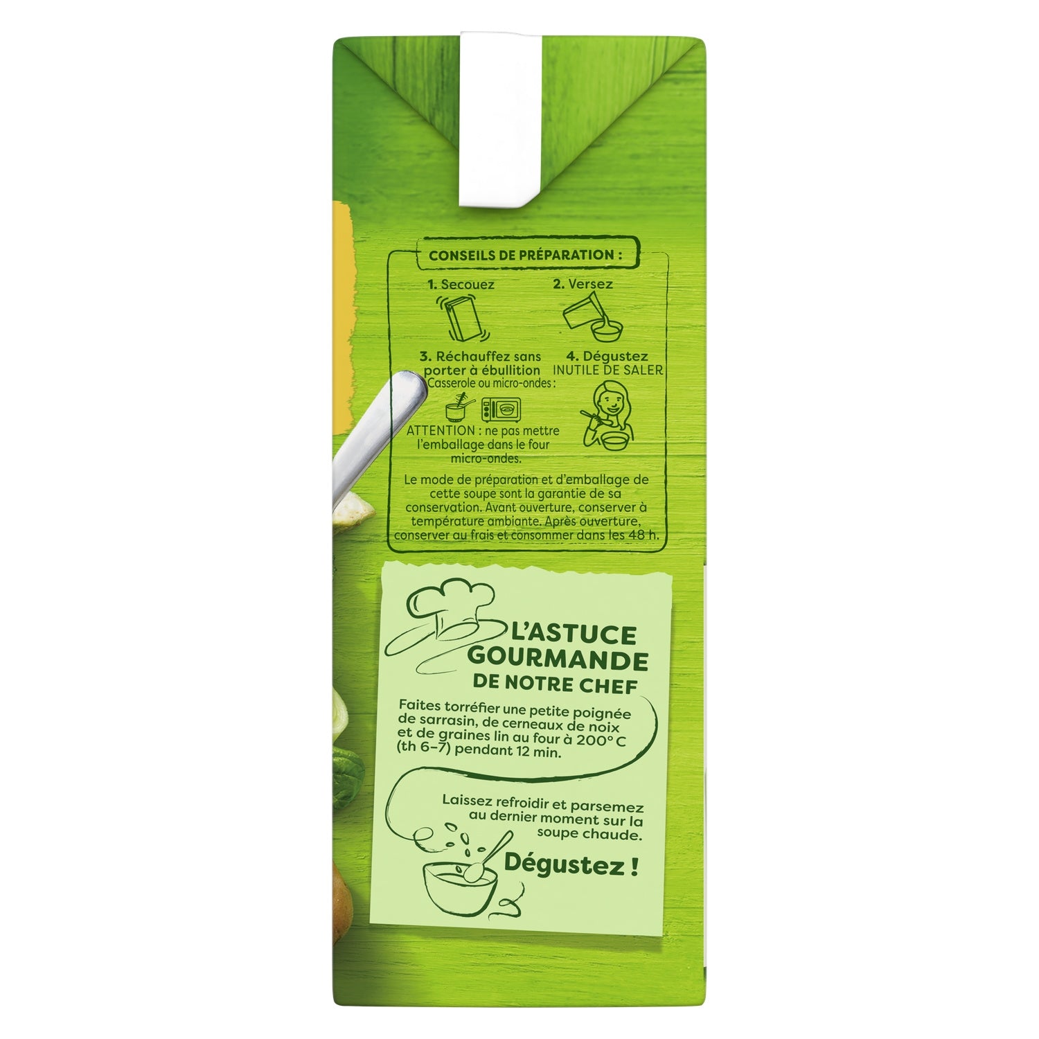 Entdecken Sie die Knorr® Grüne Gemüsesuppe, ein Rezept, das den guten Geschmack von grünen Bohnen, Spinat, Brunnenkresse und Brokkoli für einen köstlichen Genussmoment vereint.,Eine Suppe mit Nutri-Score B, gekocht mit 100 % natürlichen Zutaten und Gemüse aus nachhaltiger Landwirtschaft, für eine einfache Mahlzeit voller Geschmack.,Diese vegetarische und gemüsereiche Suppe wird ohne Geschmacksverstärker, Farbstoffe oder Konservierungsstoffe zubereitet (wie alle flüssigen Suppen im Regal mit haltbaren Zutaten).,Unsere Suppenkartons, größtenteils recycelbar und mit den Labels FSC® und ASI® zertifiziert, unterstützen die nachhaltige Beschaffung von Karton und Aluminium.,In diesem 1-Liter-Format können Sie 4 großzügige Schüsseln Gemüsesuppe servieren.,Ein wohltuendes Suppenrezept, das einfach und schnell zubereitet ist: schütteln, einschenken, erhitzen ohne zu kochen ... und genießen!