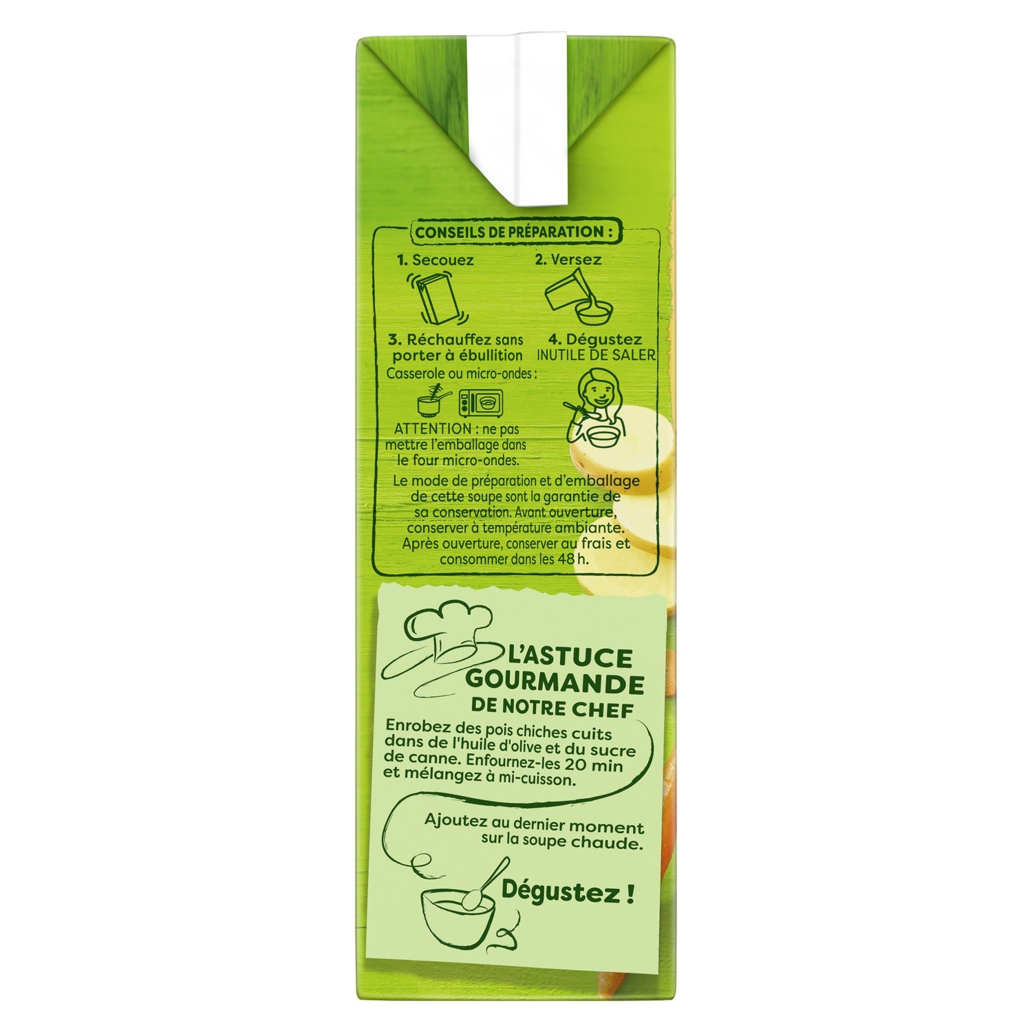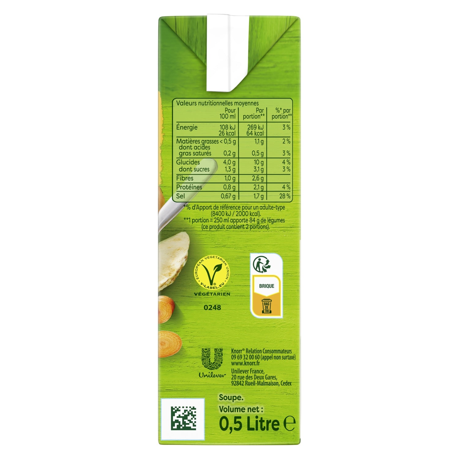 Entdecken Sie die Knorr ® Gemüsesuppe und ihren unnachahmlichen Geschmack, der die Süße von Gemüse mit einer runden und breiigen Konsistenz kombiniert: ein Genuss für die ganze Familie!,Eine Suppe mit Nutri-Score B, gekocht mit 100 % natürlichen Zutaten und Gemüse aus nachhaltigem Anbau, für eine einfache, geschmackvolle Mahlzeit.,Diese vegetarische, gemüsereiche Suppe wird ohne Geschmacksverstärker, Farbstoffe oder Konservierungsstoffe zubereitet (wie alle flüssigen Suppen im Bereich „Haltbar“).,Unsere Suppenkartons, größtenteils recycelbar und mit den Labels FSC® und ASI® zertifiziert, unterstützen die nachhaltige Beschaffung von Karton und Aluminium.,In diesem 50-cl-Format können Sie zwei großzügige Schüsseln Gemüsesuppe servieren.,Ein wohltuendes Suppenrezept, einfach und schnell zubereitet: schütteln, einschenken, erhitzen ohne zu kochen ... und genießen!