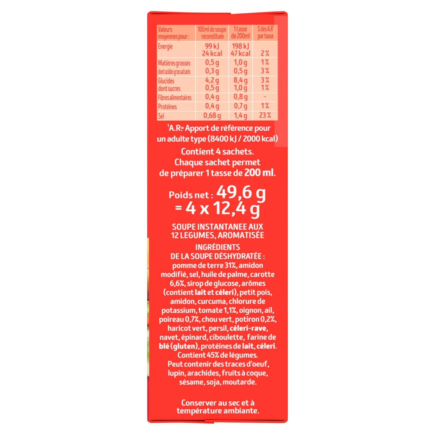 Zutaten der dehydrierten Suppe: Kartoffeln 31 %, modifizierte Stärke, Salz, Palmöl, Karotten 6,6 %, Glukosesirup, Aromen (enthält MILCH und SELLERIE), Erbsen, Stärke, Kurkuma, Kaliumchlorid, Tomaten 1,1 %, Zwiebeln, Knoblauch, Lauch 0,7 %, Grünkohl, Kürbis 0,2 %, grüne Bohnen, Petersilie, Knollensellerie, Steckrüben, Spinat, Schnittlauch, WEIZENmehl (GLUTEN), MILCHproteine, SELLERIE. Enthält 45 % Gemüse. Kann Spuren von EI, Lupine, ERDNÜSSEN, NÜSSEN, SESAM, SOJA und SENF enthalten.