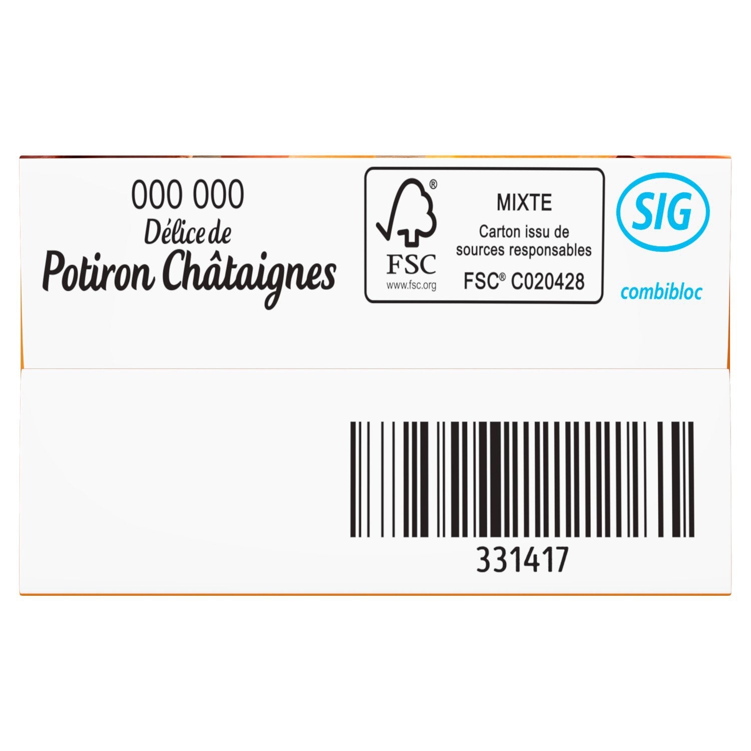 Zutaten: Wasser, rehydrierter Kürbis 16%, Kürbispüree 10%, Karotte, rehydrierte Kartoffel, Kartoffel, Tomatensaft aus Konzentrat, Kastanienstücke 1,8%, frische SAHNE, Maisstärke, Salz, Kastanienmehl 0,5%, natürliche Aromen (enthält MILCH). Kann Spuren von Weizen (GLUTEN), SELLERIE, EI, Lupine, NÜSSEN, ERDNÜSSEN, SESAM, SOJA und SENF enthalten.