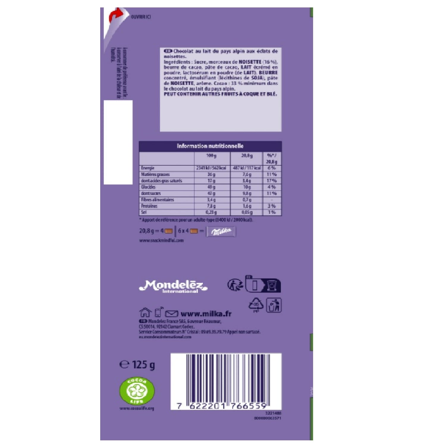 DetailsMilchschokolade aus dem Alpenraum mit Haselnussstückchen. Stückgewicht: grs EAN-Barcode: 7622201766559 Marke: MILKA