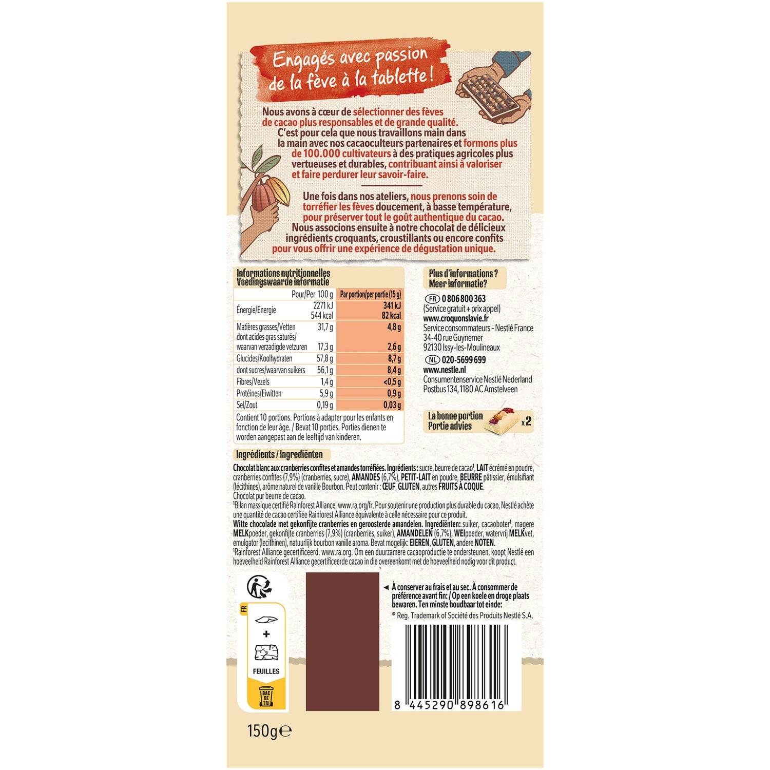 Zutaten: Zucker, Kakaobutter¹, Magermilchpulver, kandierte Cranberries (7,9%) (Cranberries, Zucker), Mandeln (6,7%), Molkenpulver, Butter, Emulgator (Lecithine), natürliches Bourbon-Vanille-Aroma. Kann enthalten: Ei, Gluten, andere Nüsse. Schokolade aus reiner Kakaobutter. ¹Rainforest Alliance-zertifizierte Massenbilanz. www.ra.org/fr. Zur Unterstützung einer nachhaltigen Produktion…