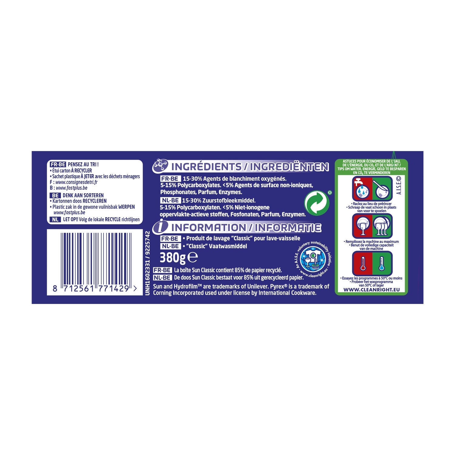 Die Geschirrspültabs Sun Classic Lemon sind auch bei kurzen Spülgängen wirksam und sorgen für perfekt sauberes Geschirr!,Sun-Tabs garantieren tadellose Ergebnisse, glänzendes und perfekt geschütztes Geschirr, auch ohne Vorspülen.,Für tadelloses Geschirr Spülgang für Spülgang denken Sie daran, zusätzlich zu Ihrem Geschirrspültab Sun Klarspüler und Sun Regeneriersalz hinzuzufügen.,Dank seiner Cleanboost-Wirkstoffe spart der Sun Classic-Tab Wasser und Strom: wirksam bei kurzen Spülgängen und bei niedrigen Temperaturen.,Unsere Sun Classic-Tabs werden in Frankreich hergestellt, in einer Fabrik, die sich für einen grüneren Planeten einsetzt.,Sun-Know-how im Dienste Ihres Geschirrspülens, in recycelter und recycelbarer Verpackung.