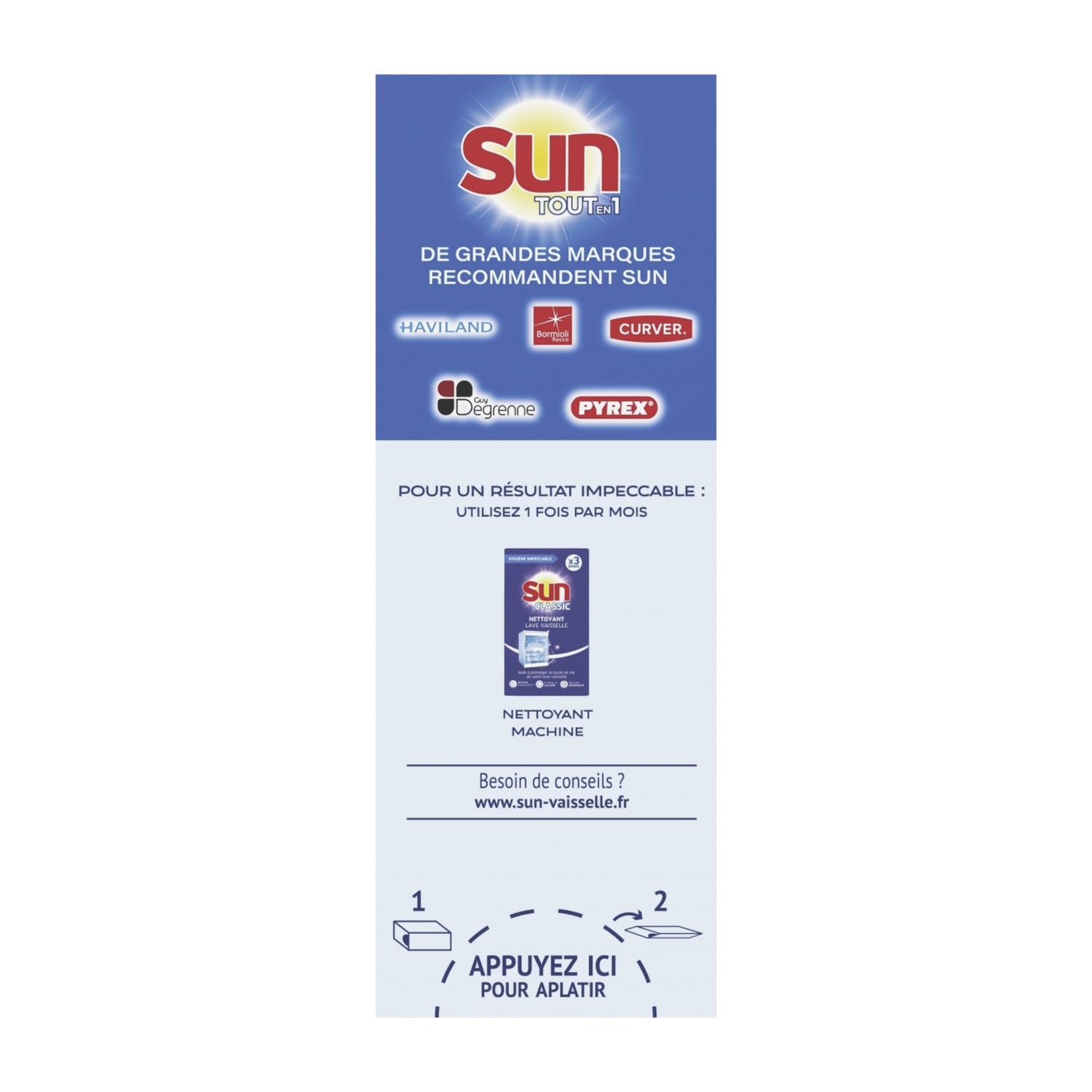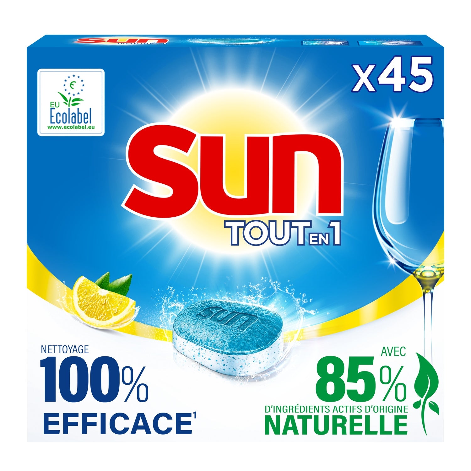 Es ist nicht immer einfach, sich zwischen Effizienz und mehr Umweltfreundlichkeit zu entscheiden. Entscheiden Sie sich mit Sun für Produkte, die jetzt 100 % wirksam bei über 99 alltäglichen Flecken sind, darunter auch Stärkeflecken in den 10 am häufigsten gekochten Gerichten in Frankreich. Mit weiterhin 85 % Wirkstoffen natürlichen Ursprungs bieten wir Ihnen eine Komplettlösung in einer einzigen Tablette: Die Formel Sun All In 1 Lemon Ecolabel 45 Washes entfernt hartnäckige Flecken und garantiert strahlendes Geschirr bei jedem Spülgang unter Einhaltung der Umweltzeichen-Spezifikationen. TEFAL hat Labortests durchgeführt, um herauszufinden, welche Geschirrspülmittel unter ihren Produkten am schonendsten sind, insbesondere bei Induktionspfannen. Unsere Tabletten zeichnen sich dadurch aus, dass sie Küchenutensilien, insbesondere induktionsgeeignete Töpfe und Pfannen, am schonendsten behandeln, mit einem bemerkenswerten Effekt: Ihr Geschirr hält wirklich länger! Unsere neue Formel legt sich wie eine Schutzschicht auf Ihre Pfannen und beugt so Verschleiß vor. Profitieren Sie davon und sparen Sie Zeit, indem Sie Ihre Pfannen (auch Induktionspfannen) ohne schlechtes Gewissen in die Spülmaschine geben! Nie wieder Handspülen, Sun kümmert sich um alles! Die Geschirrspültabs von Sun All in 1 sind einfach in der Anwendung und wurden speziell entwickelt, um Ihnen den Alltag zu erleichtern und Spülgang für Spülgang einwandfreie Ergebnisse zu gewährleisten, auch ohne Vorspülen. Diese Geschirrspültabs sind bei niedrigen Temperaturen sowie in Öko- und Kurzzyklen wirksam und sparen Wasser, Zeit und Energie. Dank ihrer vollständigen Formel bieten die Geschirrspültabs von Sun All in 1 eine umfassende Wirkung: Sie müssen kein Regeneriersalz zum Schutz vor Kalkablagerungen oder Klarspüler zum Glänzen hinzufügen! Unsere Geschirrspültabs werden in Frankreich hergestellt und befinden sich in einem wasserlöslichen Beutel, den Sie für eine praktischere Anwendung nicht herausnehmen müssen. Sie enthalten keine Phosphate und werden in einer vollständig recycelbaren Kartonverpackung aus 90 % Recyclingkarton verkauft, die nach jedem Gebrauch wieder verschlossen werden muss, um den Inhalt vor Feuchtigkeit zu schützen! *Im Vergleich zur vorherigen Formel.