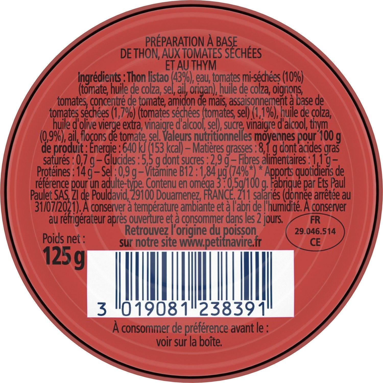 Echter Thunfisch (43%), Wasser, halbgetrocknete Tomaten (10%) (Tomaten, Rapsöl, Salz, Knoblauch, Oregano), Rapsöl, Zwiebeln, Tomaten, Tomatenmark, Maisstärke, Würzmischung auf Basis getrockneter Tomaten (1,7%) (getrocknete Tomaten (Tomaten, Salz) (1,1%), Rapsöl, natives Olivenöl extra, Branntweinessig, Salz), Zucker, Branntweinessig, Thymian (0,9%), Knoblauch, Tomatenflocken, Salz.
