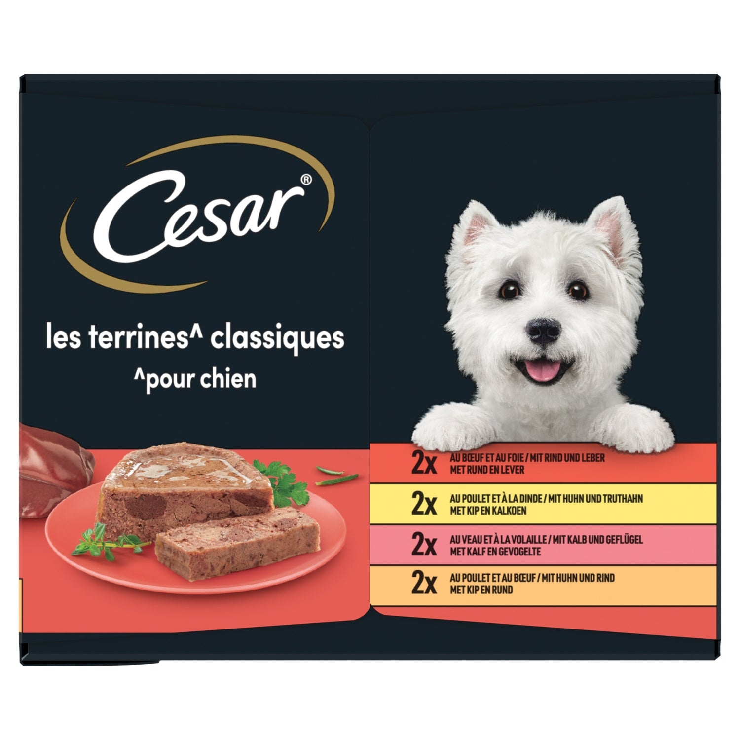 Die Cesar® Classic Terrines für Hunde bieten zeitlose und authentische Rezepte mit hochwertigen Proteinen und natürlichem Geschmack. Ein leckeres Hundefutter mit feinen, hochwertigen Häppchen, zubereitet mit natürlichen Zutaten*, sorgfältig ausgewählt für den empfindlichen Gaumen Ihres Hundes. 100 % vollwertig und ausgewogen, sind die Cesar® Classic Terrines** gesunde und leckere Mahlzeiten, die ihn jeden Tag erfreuen. Cesar® weiß, was Ihr kleiner Hund braucht. Eine einfache und großzügige Rezeptur, ohne Zuckerzusatz oder künstliche Aromen. **Terrinen für Hunde