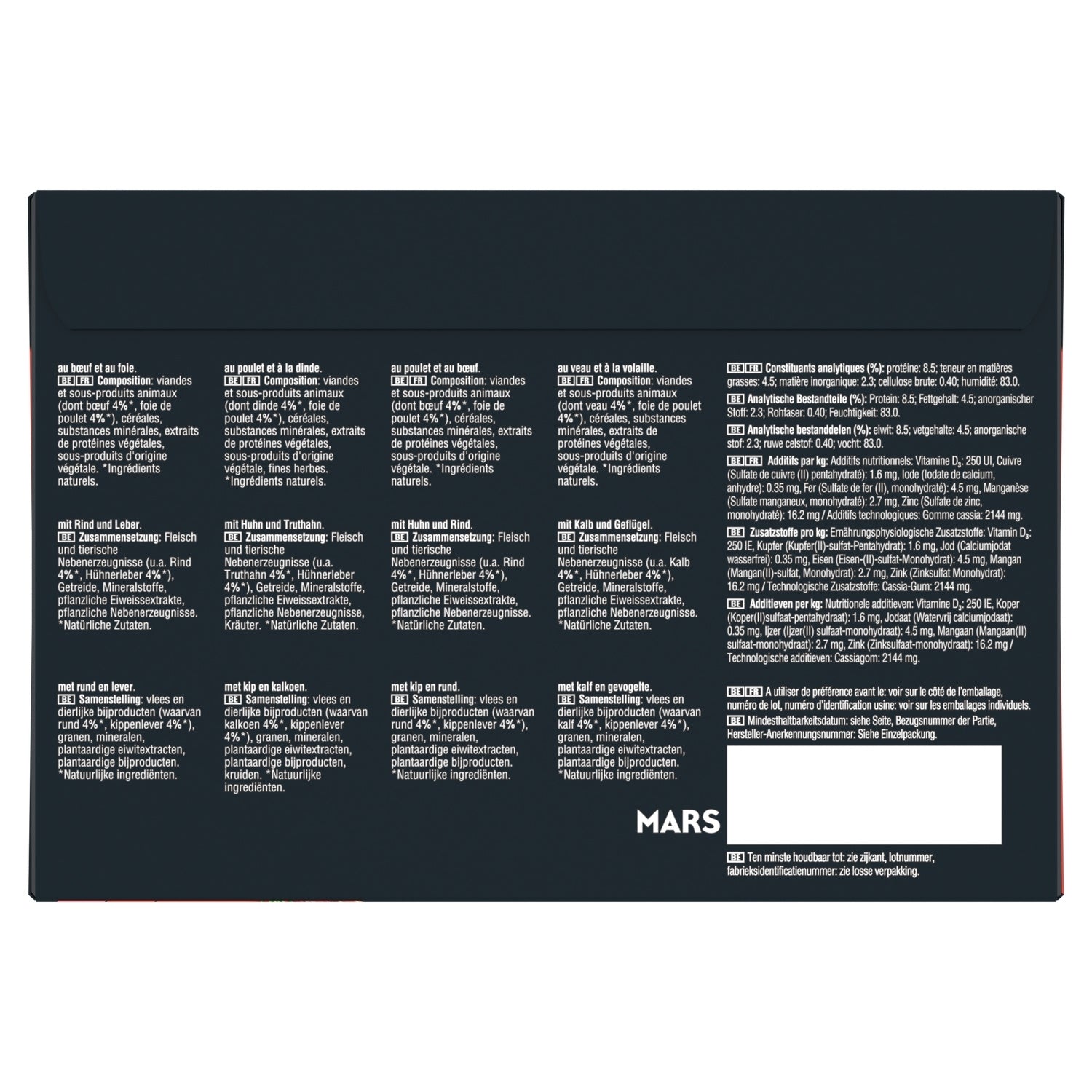 Rindfleisch und Leber: Fleisch und tierische Nebenerzeugnisse (u.a. Rindfleisch 4 %*, Hühnerleber 4 %*), Getreide, Mineralstoffe, pflanzliche Eiweißextrakte, pflanzliche Nebenerzeugnisse. Huhn und Pute: Fleisch und tierische Nebenerzeugnisse (u.a. Pute 4 %*, Hühnerleber 4 %*), Getreide, Mineralstoffe, pflanzliche Eiweißextrakte, pflanzliche Nebenerzeugnisse, Kräuter. Huhn und Rindfleisch: Fleisch und tierische Nebenerzeugnisse (u.a. Rindfleisch 4 %*, Hühnerleber 4 %*), Getreide, Mineralstoffe, pflanzliche Eiweißextrakte, pflanzliche Nebenerzeugnisse. Kalbfleisch und Geflügel: Fleisch und tierische Nebenerzeugnisse (u.a. Kalbfleisch 4 %*, Hühnerleber 4 %*), Getreide, Mineralstoffe, pflanzliche Eiweißextrakte, pflanzliche Nebenerzeugnisse. *Natürliche Zutaten.