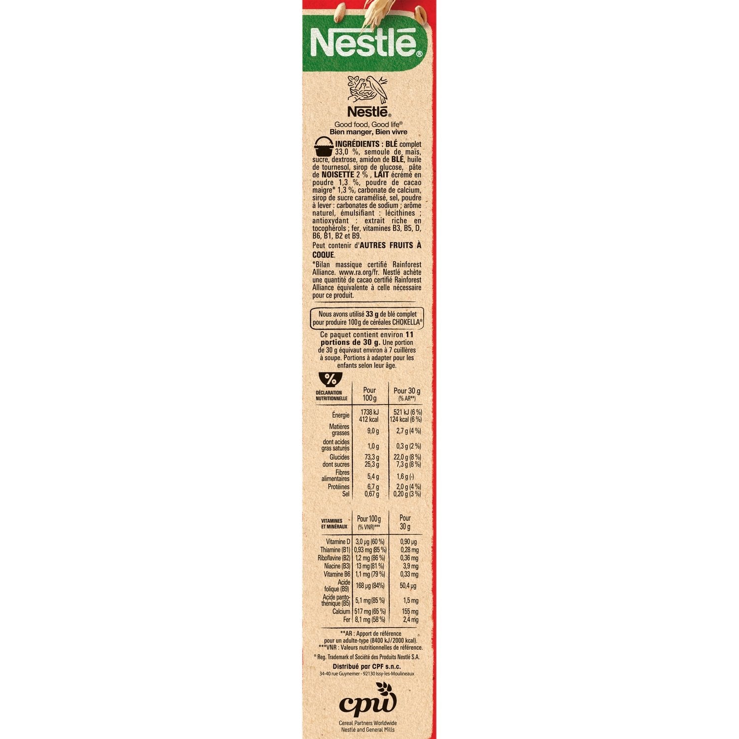 Zutaten: Vollkornweizen 33,0 %, Maisgrieß, Zucker, Dextrose, Weizenstärke, Sonnenblumenöl, Glukosesirup, Haselnusspaste 2 %, Magermilchpulver 1,3 %, fettarmes Kakaopulver* 1,3 %, Calciumcarbonat, Karamellzuckersirup, Salz, Backtriebmittel: Natriumcarbonate; natürliches Aroma, Emulgator: Lecithine; Antioxidationsmittel: stark tocopherolhaltiger Extrakt; Eisen, Vitamin B3, B5, D, B6, B1, B2 und B9. Kann ANDERE NÜSSE enthalten. *Rainforest Alliance-zertifizierte Massenbilanz. www.ra.org/fr. Nestlé kauft eine äquivalente Menge Rainforest Alliance-zertifizierten Kakaos, wie für dieses Produkt benötigt wird.