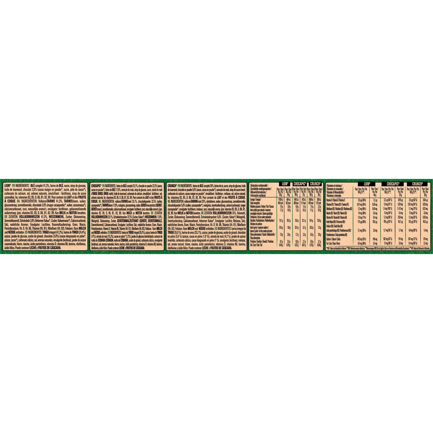 Zutaten: Lion: Vollkornweizen 41,3%, Weizenmehl, Zucker, Glukosesirup, Sonnenblumenöl, Schokolade 3,0% (fettarmes Kakaopulver*, Zucker, Kakaomasse*), Calciumcarbonat, Salz, natürliche Aromen, Emulgator: Lecithine, Karamellzuckersirup, Eisen, Vitamine B3, B5, D, B6, B1, B2, B9. Kann Milch und Nüsse enthalten. Chocapic: Vollkornweizenmehl 35,1%, Schokoladenpulver…