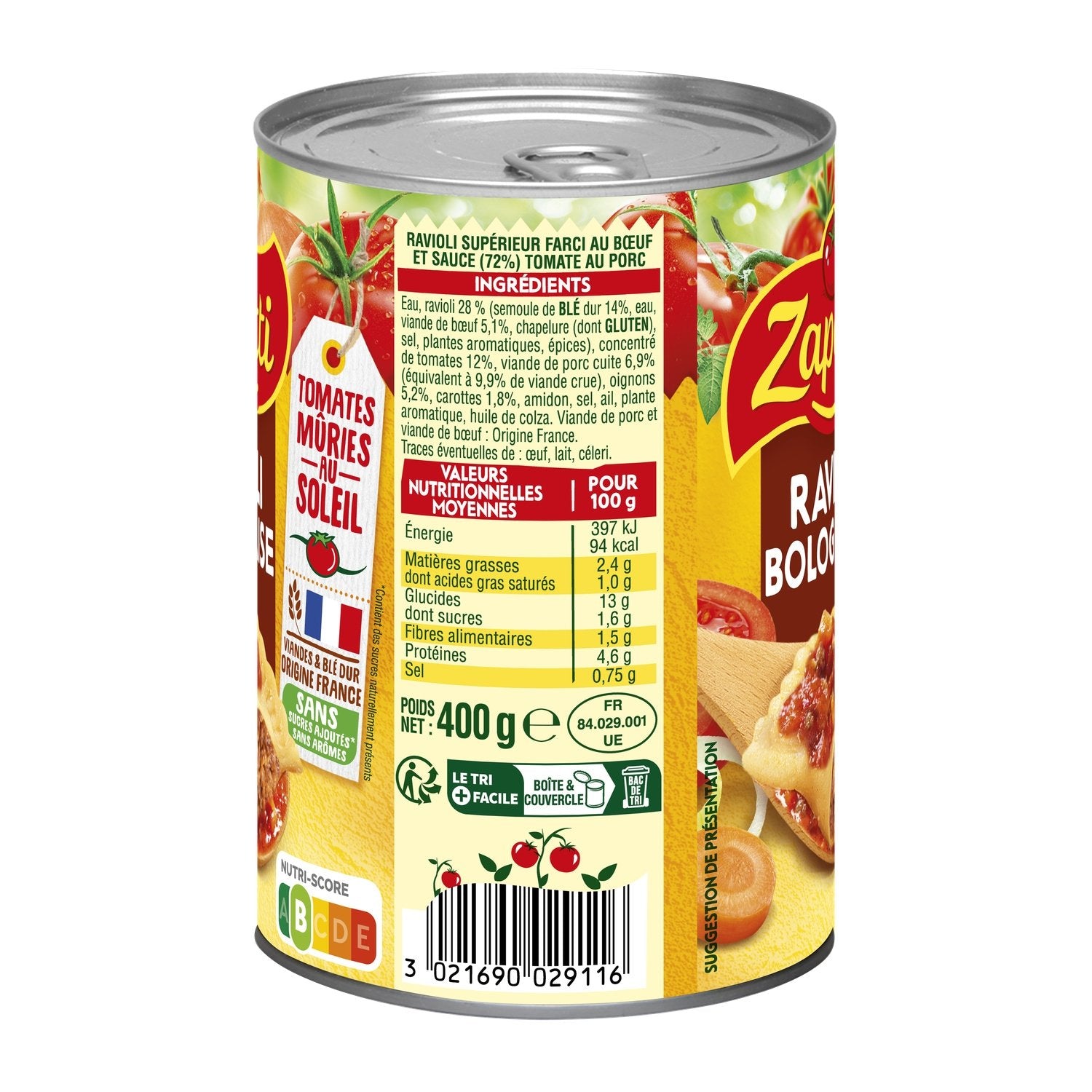 Wasser, Ravioli 28 % (HartWEIZENgrieß 14 %, Wasser, Rindfleisch 5,1 %, Paniermehl (einschließlich GLUTEN), Salz, aromatische Pflanzen, Gewürze), Tomatenmark 12 %, gekochtes Schweinefleisch 6,9 % (entspricht 9,9 % rohem Fleisch), Zwiebeln 5,2 %, Karotten 1,8 %, Stärke, Salz, Knoblauch, aromatische Pflanzen, Rapsöl. Schweine- und Rindfleisch: Herkunft Frankreich.