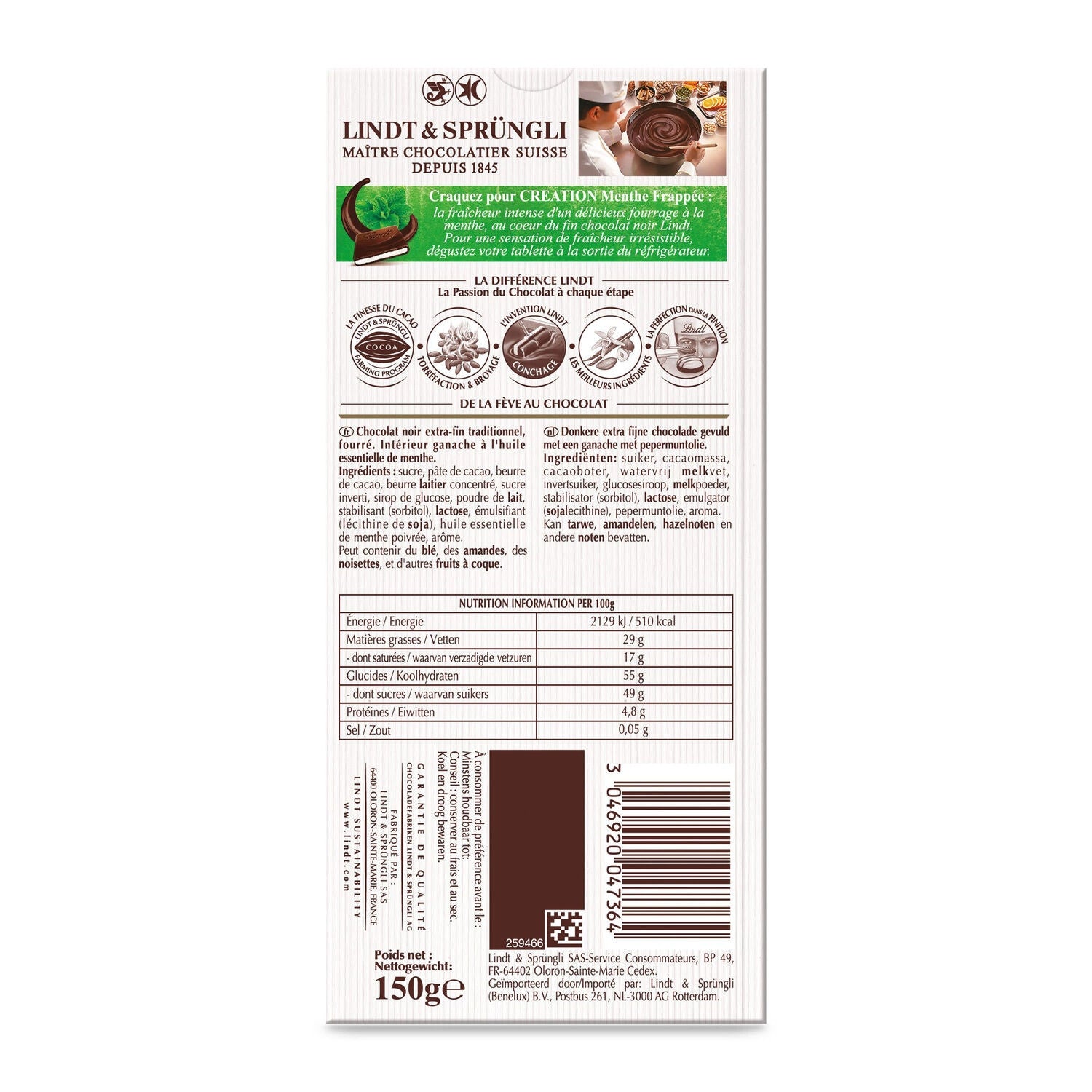 Erliegen Sie dem Lindt CREATION Mint Frappée: Die intensive Frische einer köstlichen Minzfüllung, im Herzen feiner Lindt-Bitterschokolade, für ein unwiderstehliches Frischegefühl!