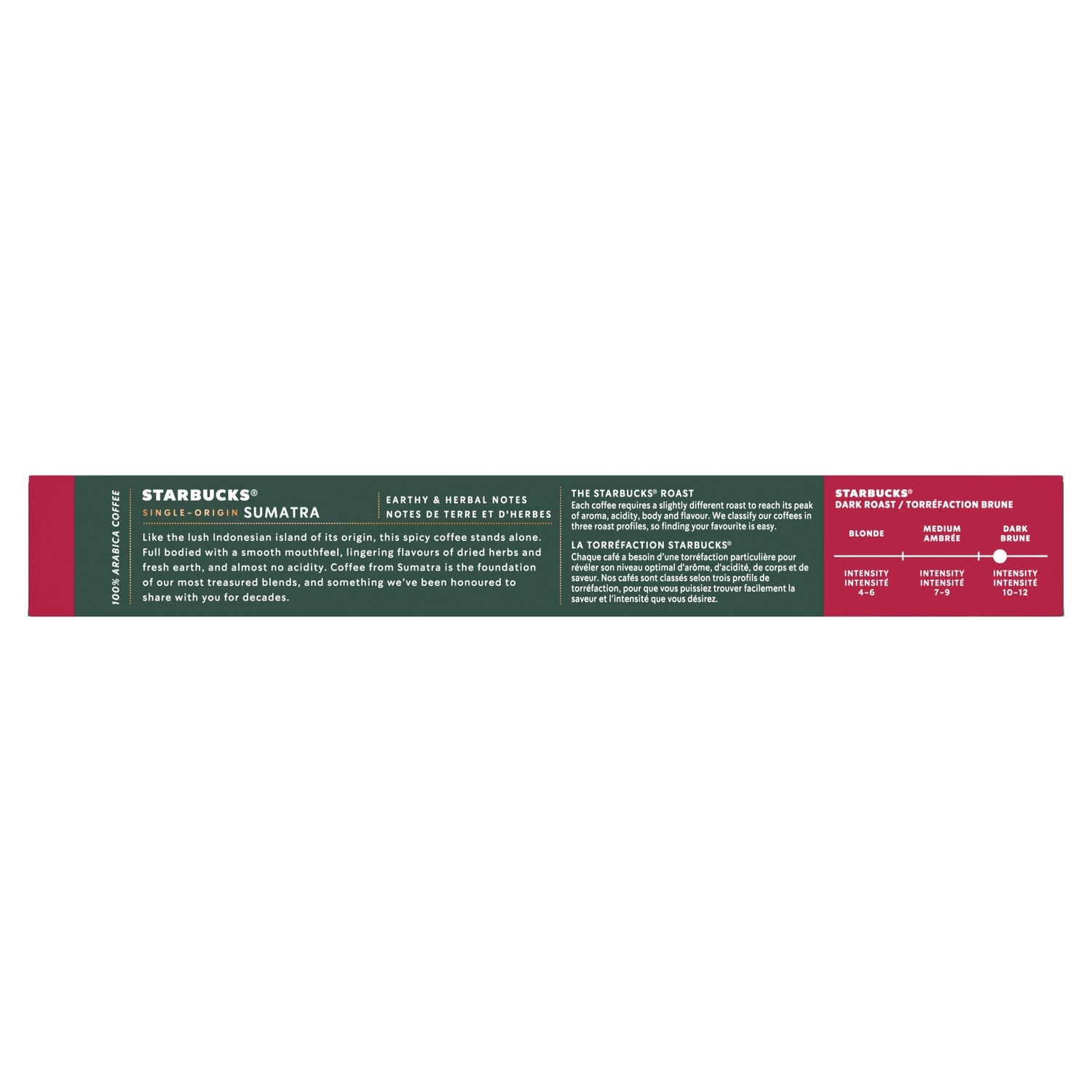 Découvrez les capsules STARBUCKS Sumatra by NESPRESSO un café 100% pur Arabica d'origine Sumatra à préparer chez vous avec votre machine NESPRESSO. Ce café propose une douce sensation en bouche, des arômes prolongés d'herbes séchées et de terre fraîche, et presque aucune acidité. Un format boîte contenant 10 capsules vous permet de préparer 10 tasses de café STARBUCKS Sumatra. Intensité 10.