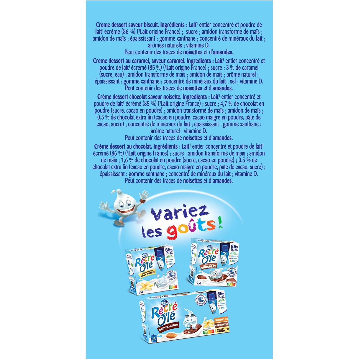 BISCUIT : LAIT origine France 86% (LAIT entier concentré, poudre de LAIT écrémé), sucre, amidon transformé de maïs, amidon de maïs, épaississant : gomme xanthane, concentré de minéraux du LAIT, arômes naturels, vitamine D. CARAMEL : LAIT origine France 85% (LAIT entier concentré, poudre de LAIT écrémé),sucre, caramel 3 %(sucre, eau),amidon transformé de maïs, amidon de maïs, arôme naturel, épaississant : gomme xanthane, concentré de minéraux du LAIT, sel, vitamine D. CHOCOLAT SAVEUR NOISETTE : LAIT origine France 85% (LAIT entier concentré, poudre de LAIT écrémé), sucre, chocolat en poudre 4,6% (sucre, cacao en poudre), amidon transformé de maïs, amidon de maïs, chocolat extra fin 0,5 %(cacao en poudre, cacao maigre en poudre, pâte de cacao, sucre), concentré de minéraux du LAIT, épaississant : gomme xanthane, arôme naturel, vitamine D. CHOCOLAT : LAIT origine France 86% (LAIT entier concentré, poudre de LAIT écrémé), sucre, amidon transformé de maïs, amidon de maïs, chocolat en poudre 1,5% (sucre, cacao en poudre),chocolat extra fin 0,5%(cacao en poudre, cacao maigre en poudre, pâte de cacao, sucre), épaississant : gomme xanthane, concentré de minéraux du LAIT, vitamine D.