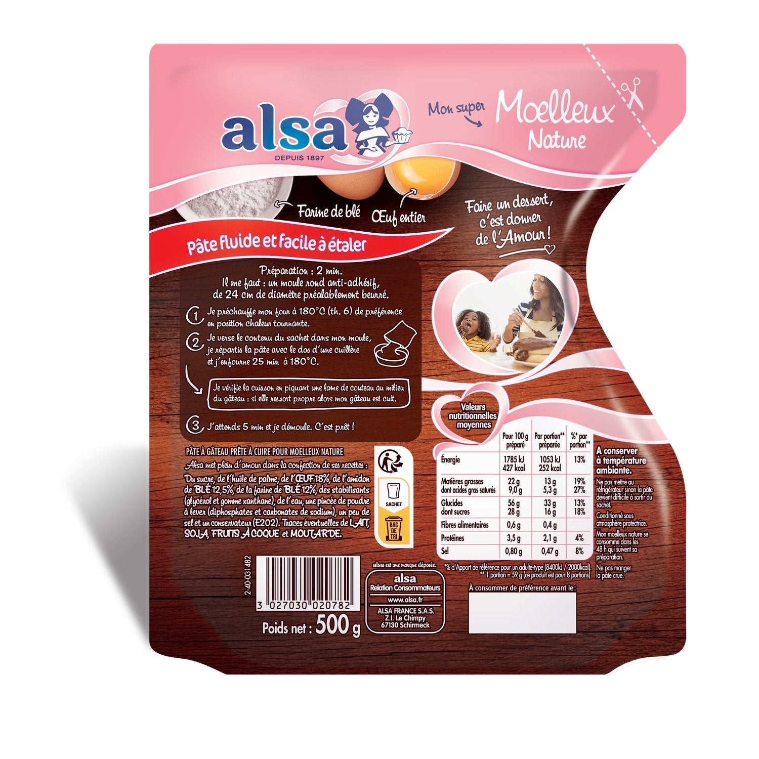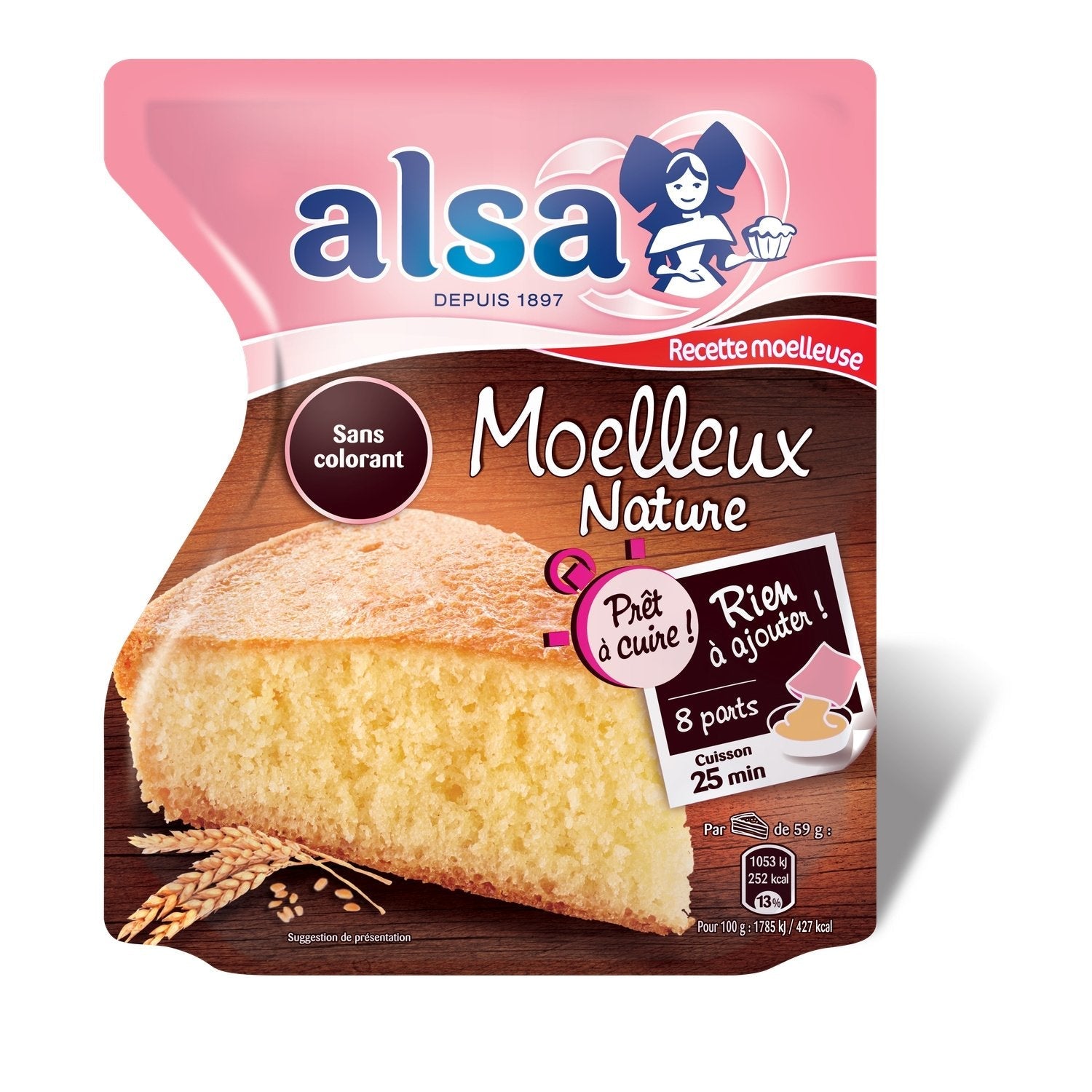 Alsa – Moelleux Nature 500g – Préparation pour gâteau facile et rapide Un délicieux gâteau au moelleux unique. Il n'y a rien à ajouter ! Il vous suffit de verser la pâte toute prête dans un moule, le placer au four avant de régaler tous les gourmands. • Une texture aérienne pour un gâteau incroyablement moelleux ; • Un goût qui plait à toute la famille ; • Un gâteau facile, rapide à préparer et inratable ; • Pour 8 personnes ; • Sans colorant, sans arôme artificiel.