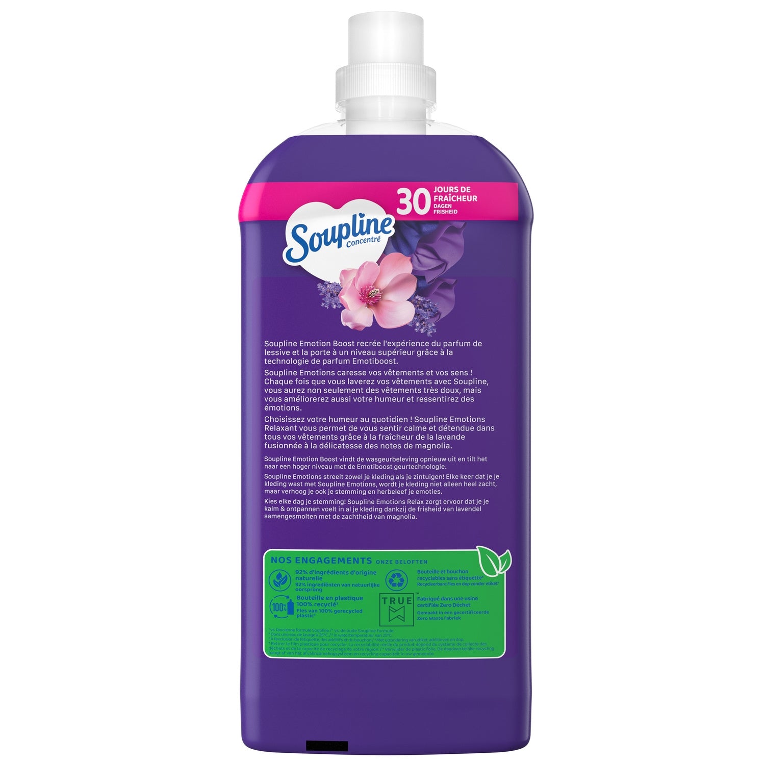Soupline Relaxing Concentrate Fabric Softener with notes of Magnolia & Lavender. Now with Emotiboost fragrance technology that boosts your mood. This fabric softener features revolutionary 3D fragrance technology.