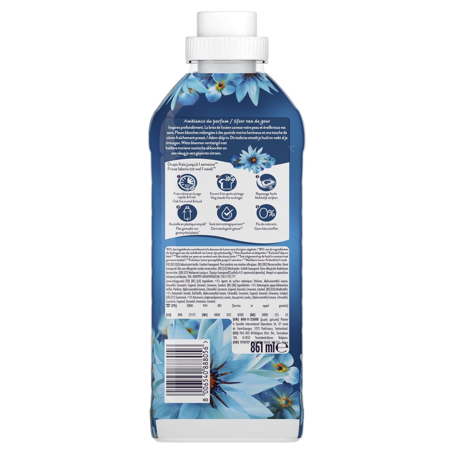 Long-lasting freshness for fresh sheets every night for up to 1 week, Take a deep breath The ocean breeze caresses your skin and revives all your senses White flowers combined with lively marine accords and a hint of freshly squeezed lemon, Plant-based softness (85% of the ingredients that contribute to Lenor's softness are plant-based), Made in France, Dermatologically tested fabric softener with tests carried out on skin in contact with washed fabric, Bottle made from 100% recycled plastic (except the cap and film) and can be recycled again, Offers freshness even in a quick and cold cycle