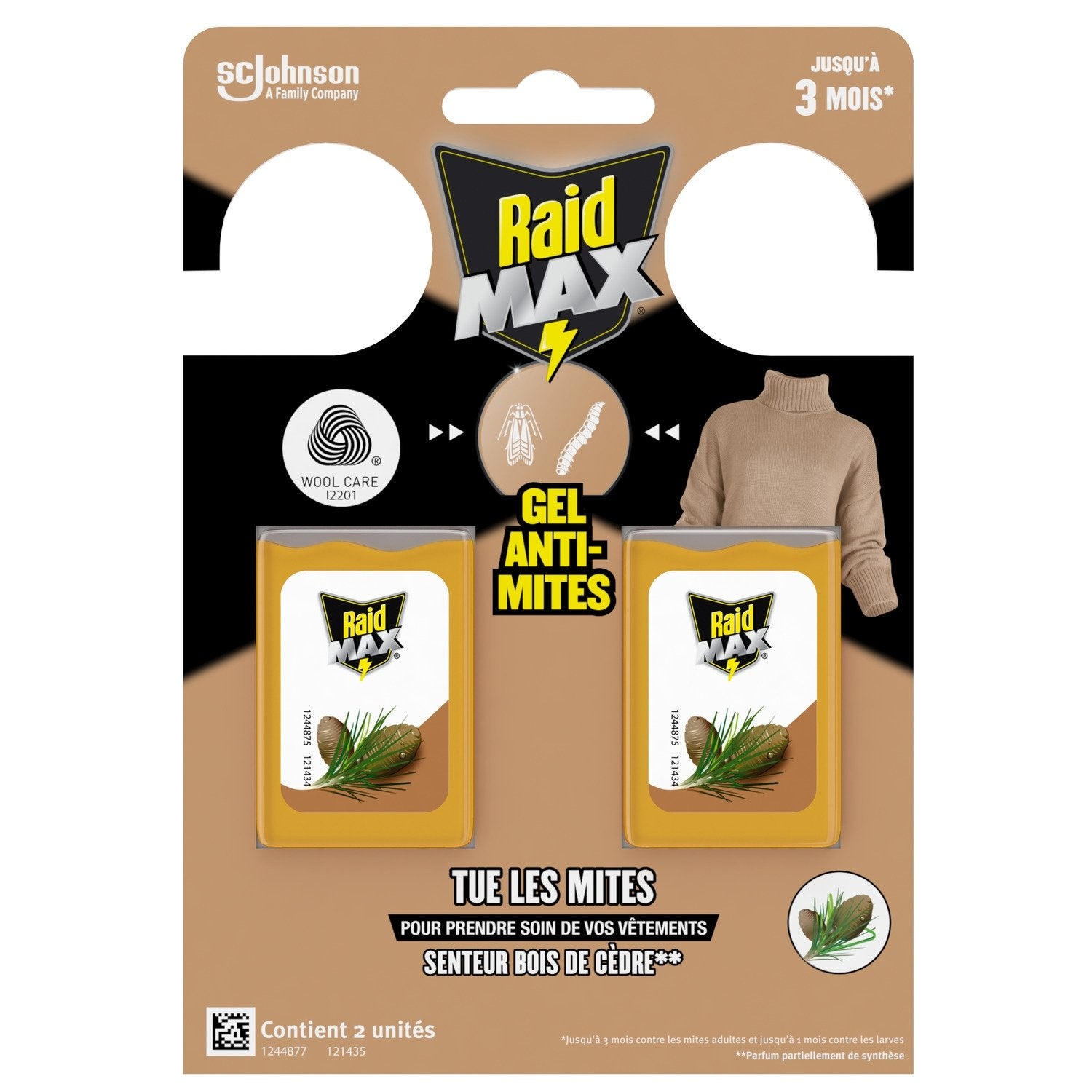 PROTECTS YOUR CLOTHES: Raid Max® Cedarwood Moth Gel kills moths to effectively protect your clothes for up to 3 months.,CEDARWOOD SCENT: Partially synthetic cedarwood fragrance.,INSECTICIDE GEL: Raid Max® Moth Gel kills moths throughout their life cycle (up to 12 weeks against adult moths and up to 4 weeks against larvae).,EASY TO USE: Simply place the product in your drawer. For maximum effectiveness, keep drawers closed. Allow 2 weeks for maximum effect.,CONTAINS: One box contains two moth gels.,Partially synthetic fragrance. Use insecticide products with caution. Before use, read the label and product information.