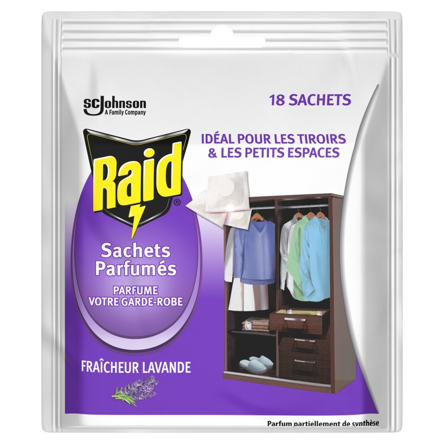 Raid® scented sachets diffuse a pleasant lavender fragrance in your wardrobe for up to 2 months. The sachets are packaged in micro-perforated sachets to: 1- Guarantee a regular and controlled diffusion of the lavender fragrance for up to 2 months. 2- Allow them to be placed directly in contact with your textiles or in the pockets of your clothes without leaving any traces or damaging them. Dangerous. Follow the precautions for use. Partially synthetic fragrance.