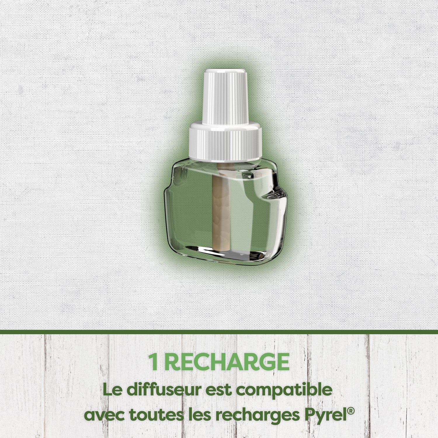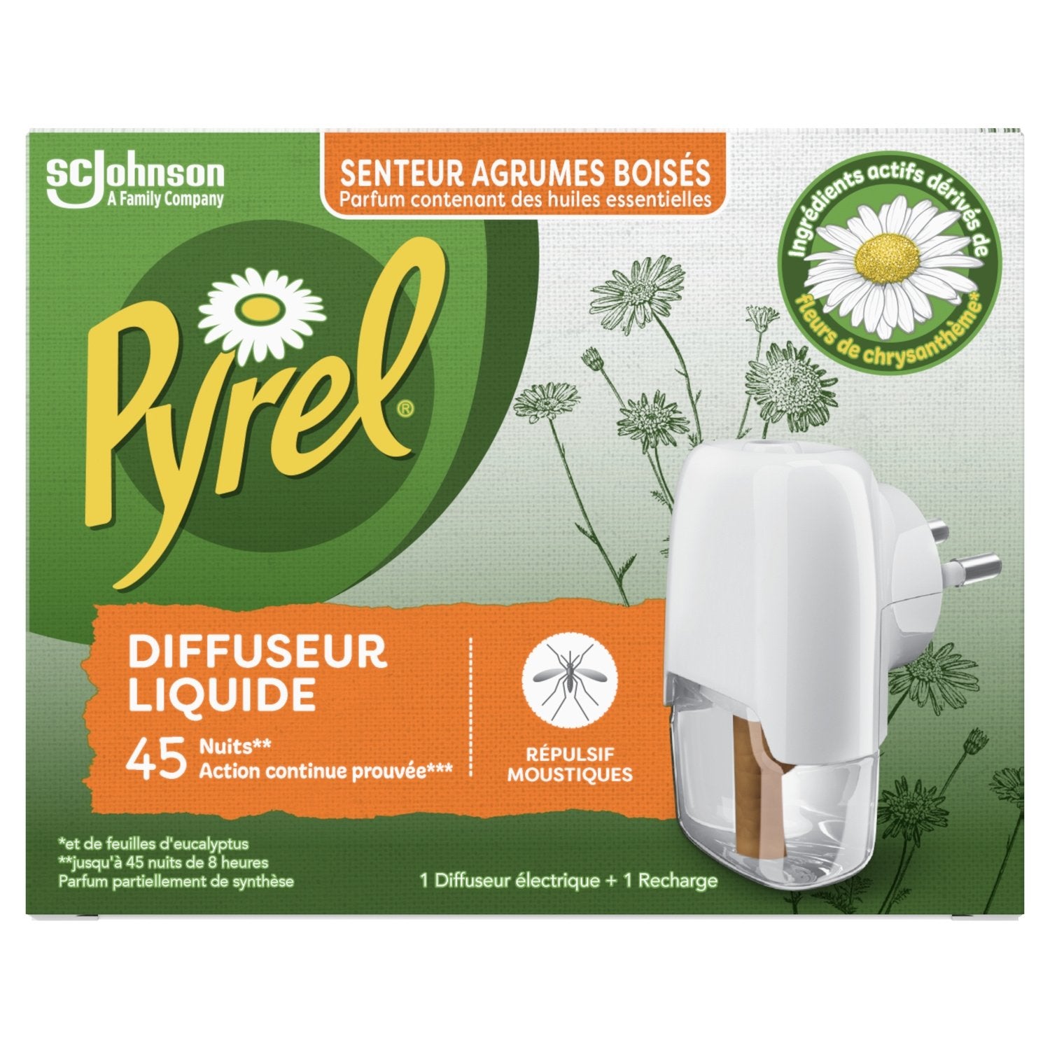 CONTINUOUS ACTION: Pyrel® electric liquid repellent diffuser with a woody citrus scent* offers protection against mosquitoes and tiger mosquitoes. PEACEFUL NIGHTS: its formula offers continuous action, proven for up to 45 nights of 8 hours**. Don't let mosquitoes impact your sleep! Repel them with the Pyrel® electric liquid diffuser, protection against mosquitoes with peace of mind! WOODY CITRUS SCENT: it diffuses a pleasant woody citrus scent. PLANT-BASED ACTIVE SUBSTANCES: contains active ingredients derived from chrysanthemum flowers and eucalyptus leaves to repel mosquitoes.**Effectiveness tested in the laboratory on the inhibition of landing of Mosquitoes and Tiger Mosquitoes (Culex and Aedes Albopictus). Use repellent products with caution. Before use, read the label and product information.