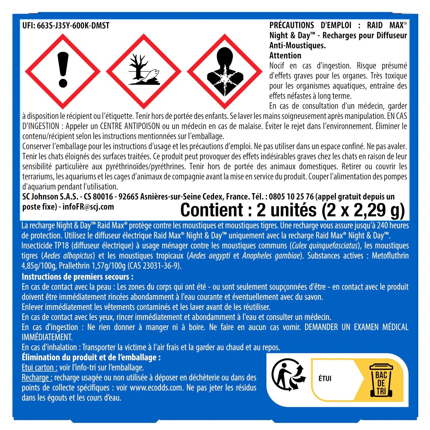 LONG-LASTING PROTECTION: The Raid Max® Night & Day™ diffuser protects you against mosquitoes and tiger mosquitoes day and night. Its formula offers proven continuous action for up to 240 hours of protection.,NO ADDED FRAGRANCE,MAXIMUM EFFECTIVENESS: Thanks to its fast action, the Night & Day™ diffuser offers you effectiveness and rapid protection against mosquitoes and tiger mosquitoes.,EASY TO USE: Insert the refill into the diffuser, then turn it clockwise until it clicks.,ONE BOX CONTAINS: Two refills.,Use insecticide products with care. Before use, read the label and product information.