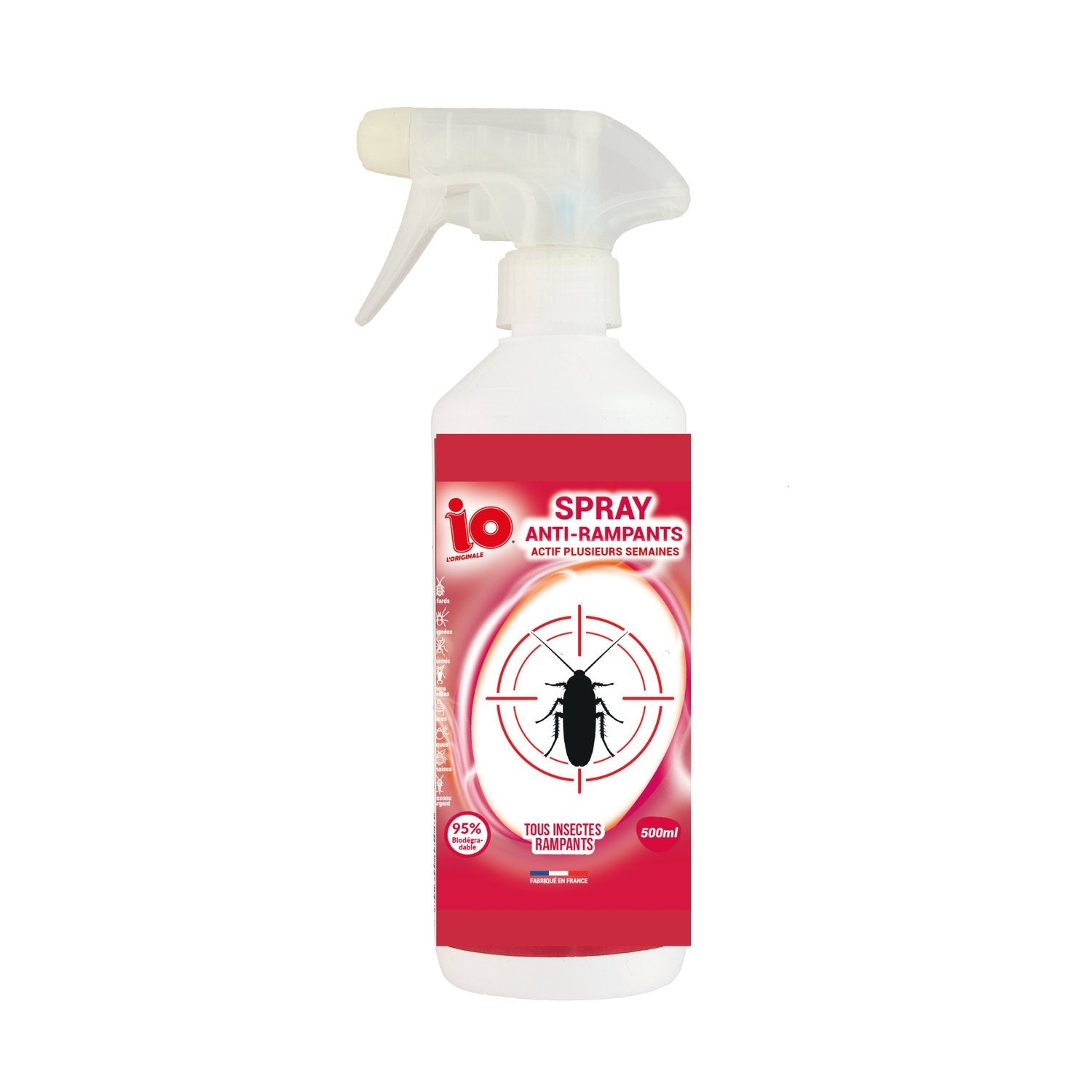 The anti-crawler spray is effective against cockroaches, spiders, bedbugs, lice, ants, woodlice, silverfish, earwigs, ticks, cockroaches, centipedes, aphids, etc. It is applied to surfaces and not in space. It dries quickly and leaves no trace. Immediate effect. An economical spray: approximately 20% of the surfaces treated = 100% of the premises protected.