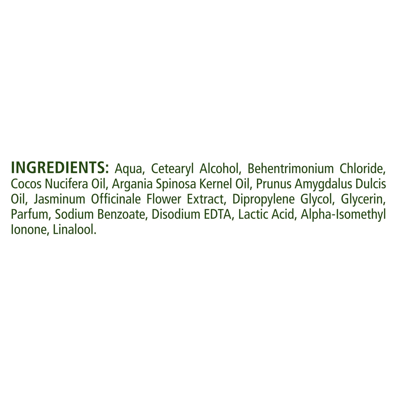 Ingredients: Aqua, Cetearyl Alcohol, Behentrimonium Chloride, Cocos Nucifera Oil, Argania Spinosa Kernel Oil, Prunus Amygdalus Dulcis Oil, Jasminum Officinale Flower Extract, Dipropylene Glycol, Glycerin, Parfum, Sodium Benzoate, Disodium EDTA, Lactic Acid, Alpha-Isomethyl Ionone, Linalool.