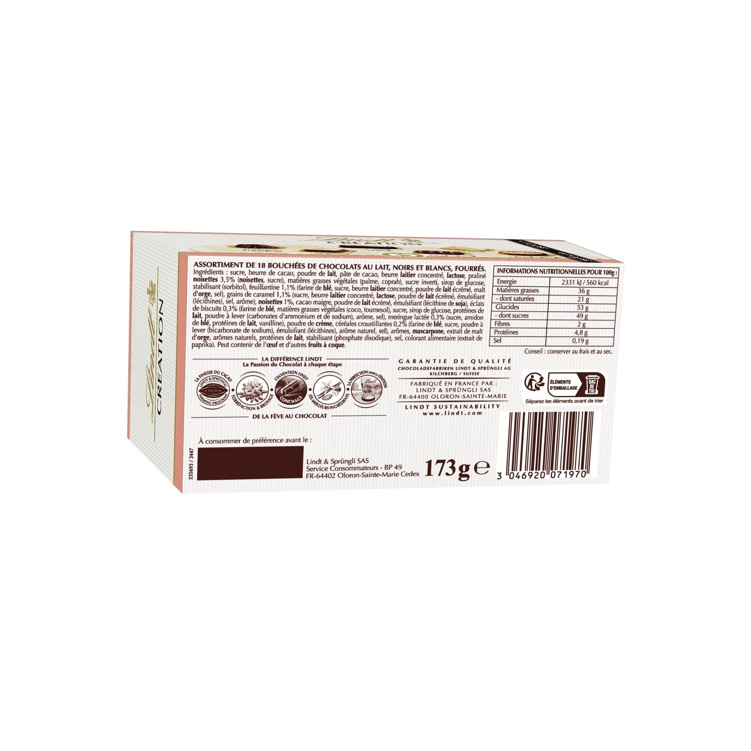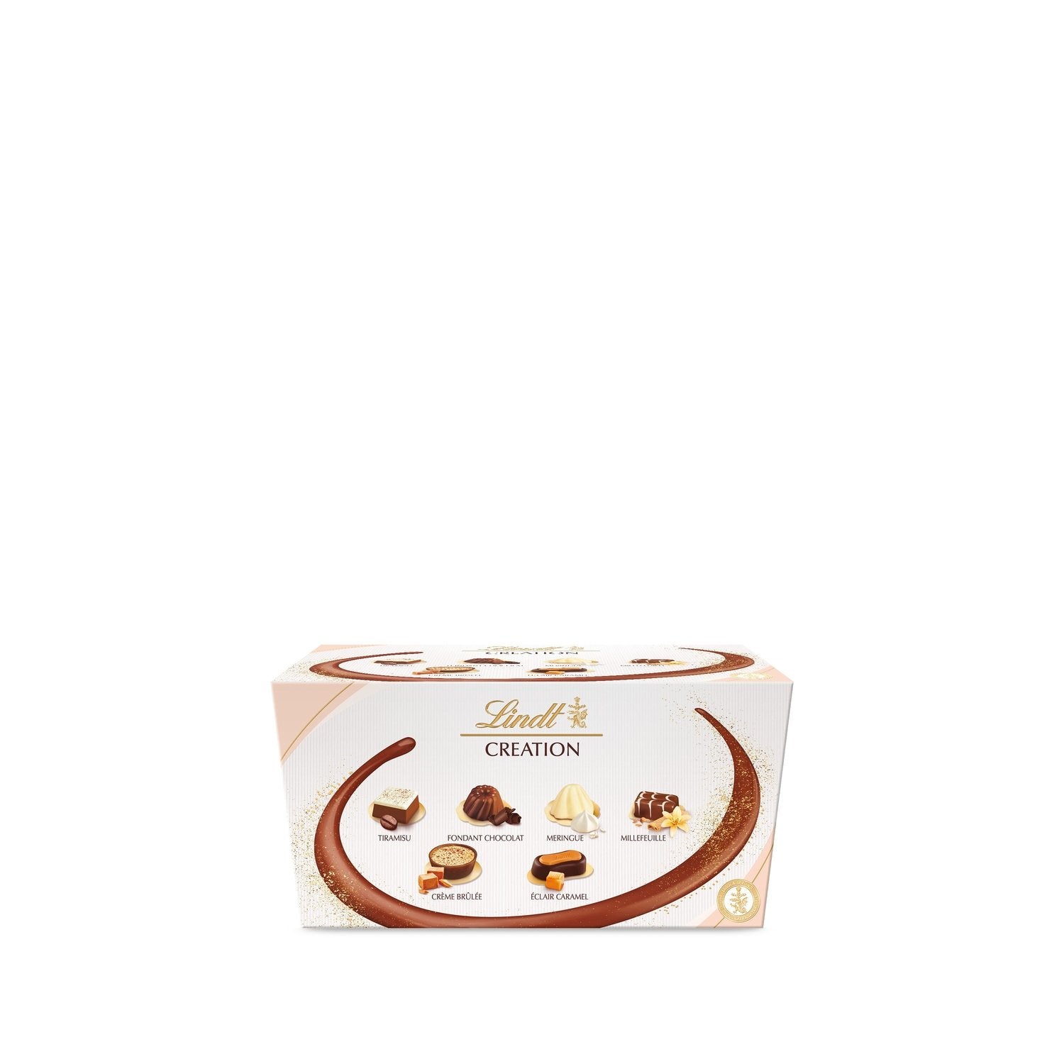 Lindt Création Dessert, an assortment of 18 fine and irresistible Lindt praline bites, Delicious chocolate bites made by our Lindt Maître Chocolatiers using the finest ingredients.,Lindt is all the finesse, passion and know-how of our Maître Chocolatiers to create delicious and irresistible chocolates to offer.,This box of chocolates contains: Caramel Eclair, Meringue, Millefeuille, Tiramisu, Chocolate Fondant, Crème Brulée