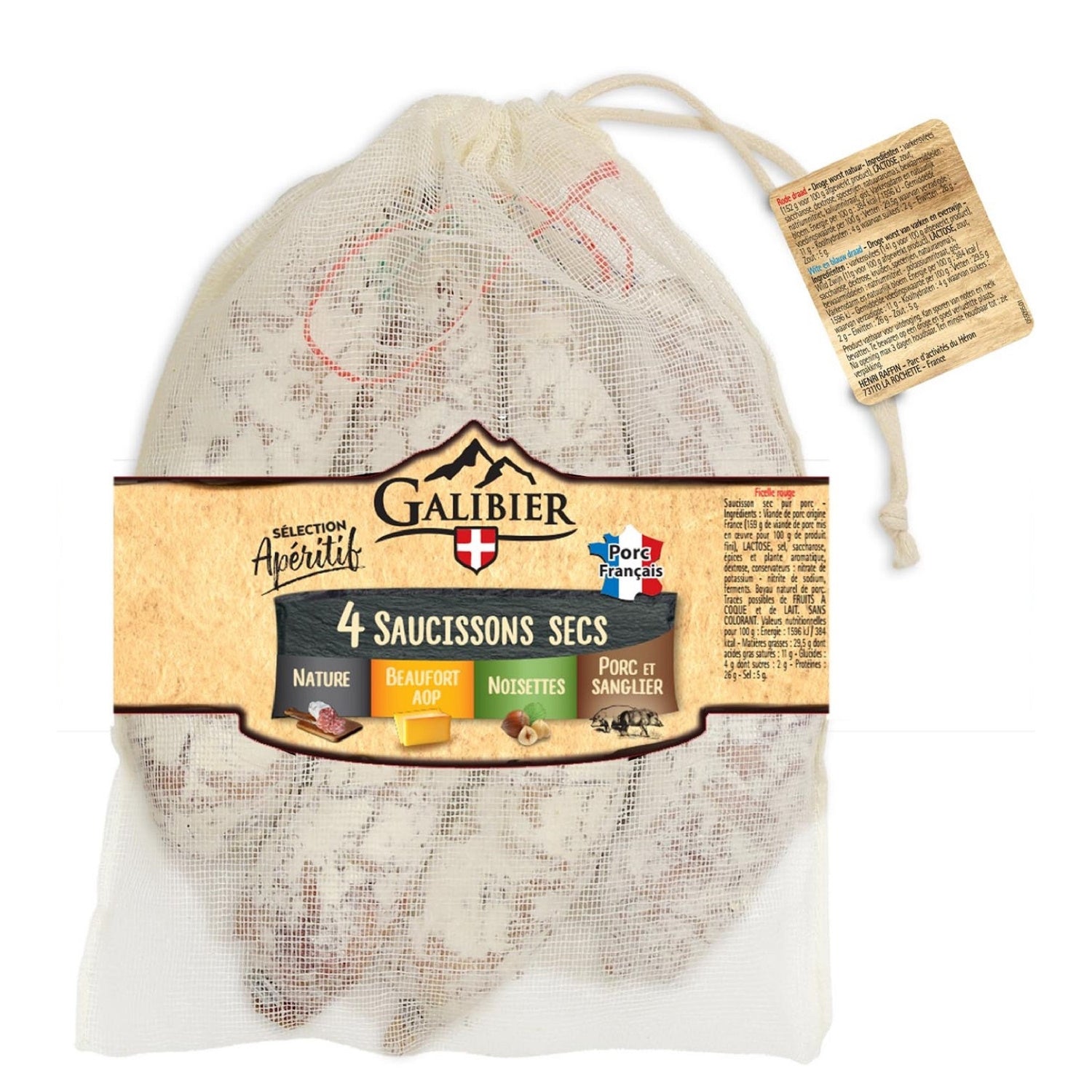 lot x4 assortments (plain, beaufort, hazelnuts, pork and wild boar) of sausages 145g Galibier