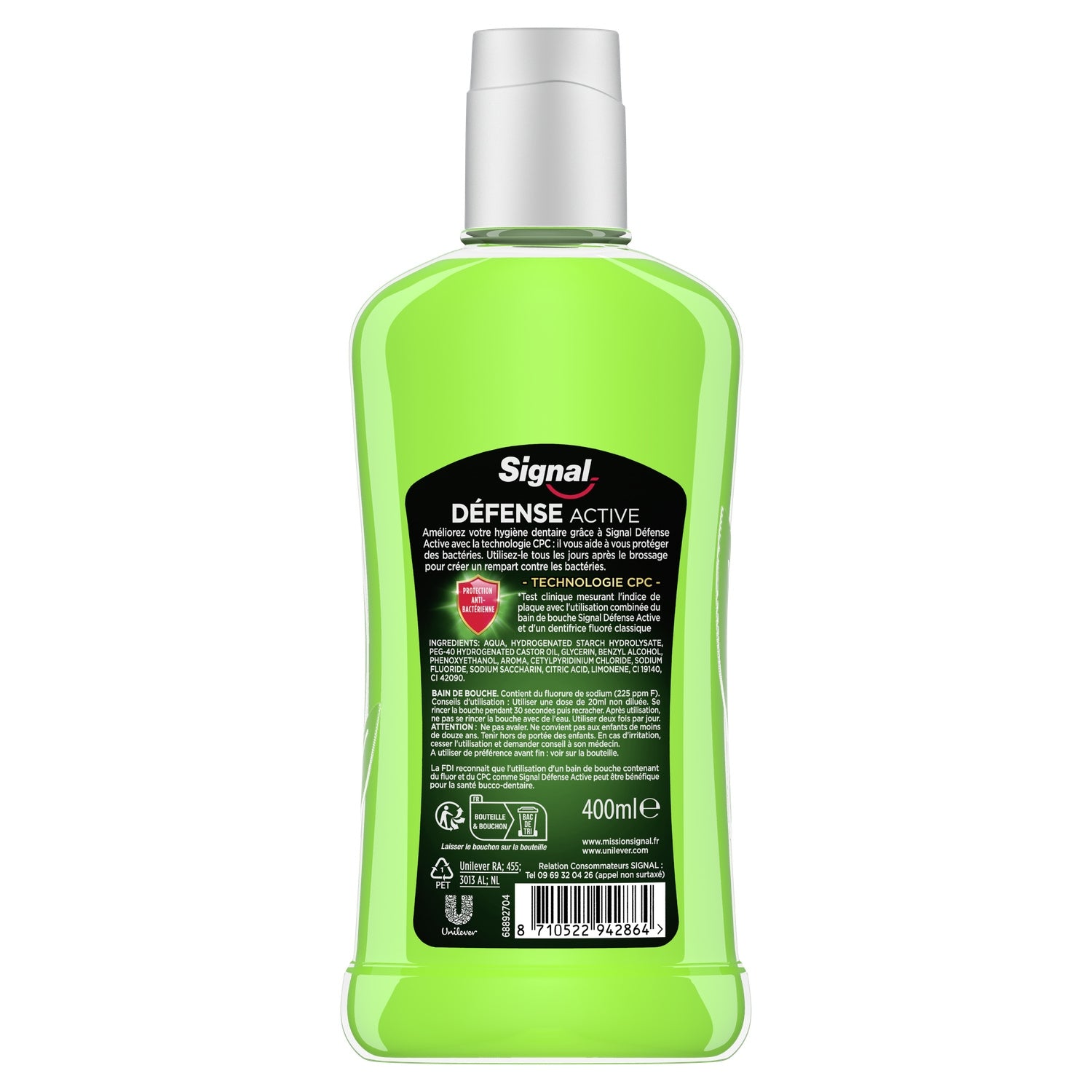 Signal Active Defense Antibacterial Mouthwash, 400 ml size,Alcohol-free mouthwash that prevents bad breath and leaves a pleasant feeling of freshness after use,Its CPC technology helps fight plaque-causing bacteria,Use it twice a day after brushing with Signal toothpaste and toothbrush as an extra measure of protection against bacteria,Cleans deep to protect your teeth and gums and provides 5 times better plaque protection in 30 days*,Helps improve oral hygiene for the whole family (from 12 years)