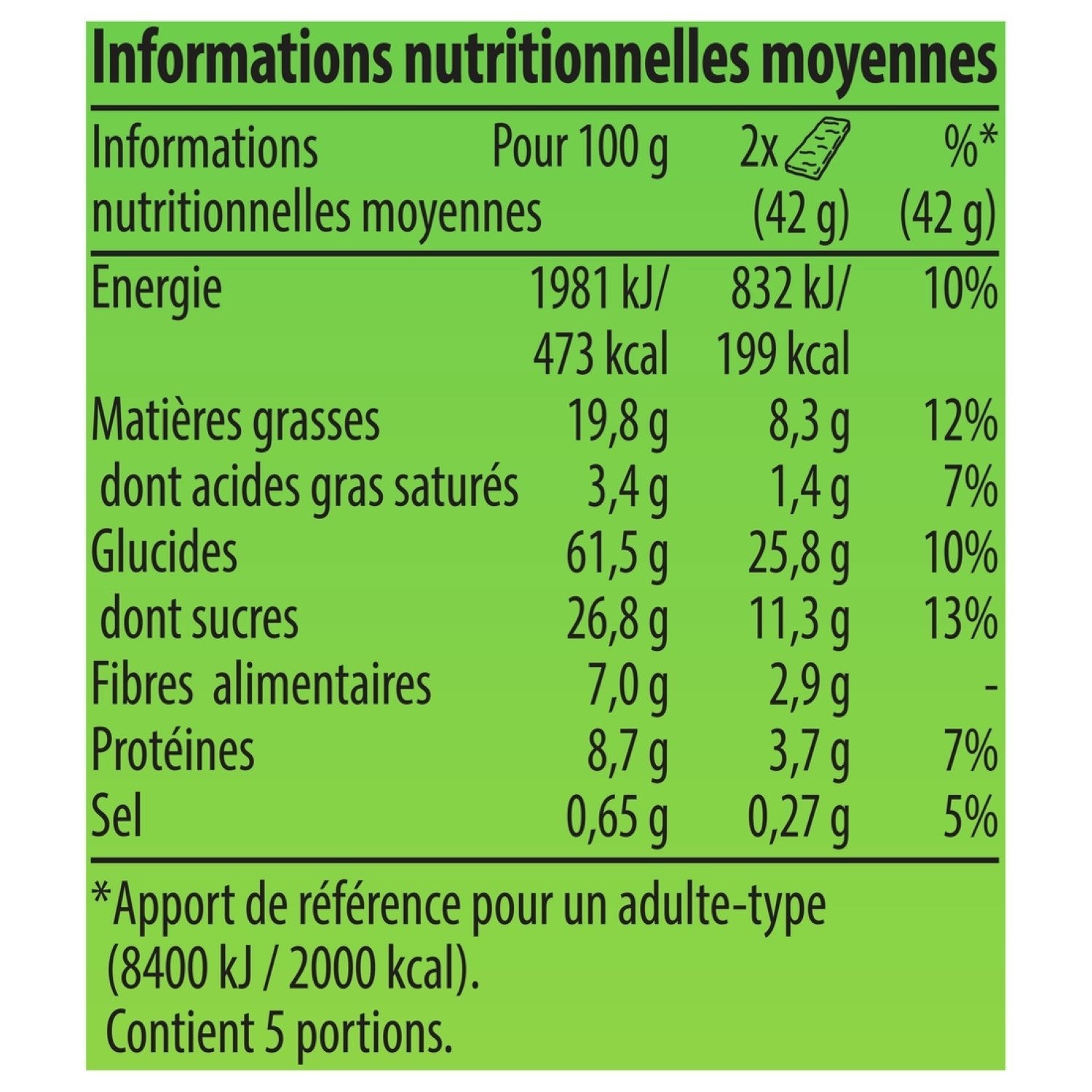 Wholegrain OATS (56%), sugar, vegetable oils (sunflower, rapeseed in varying proportions), dark chocolate chips (7%) (cocoa mass, sugar, emulsifier (lecithins (SOY)), natural vanilla flavouring), fat-reduced cocoa powder, honey, cooking salt, molasses, emulsifier (lecithins), raising agent (sodium bicarbonate), natural flavouring. Allergens: see ingredients in capital letters. MAY CONTAIN WHEAT, PEANUTS AND NUTS.