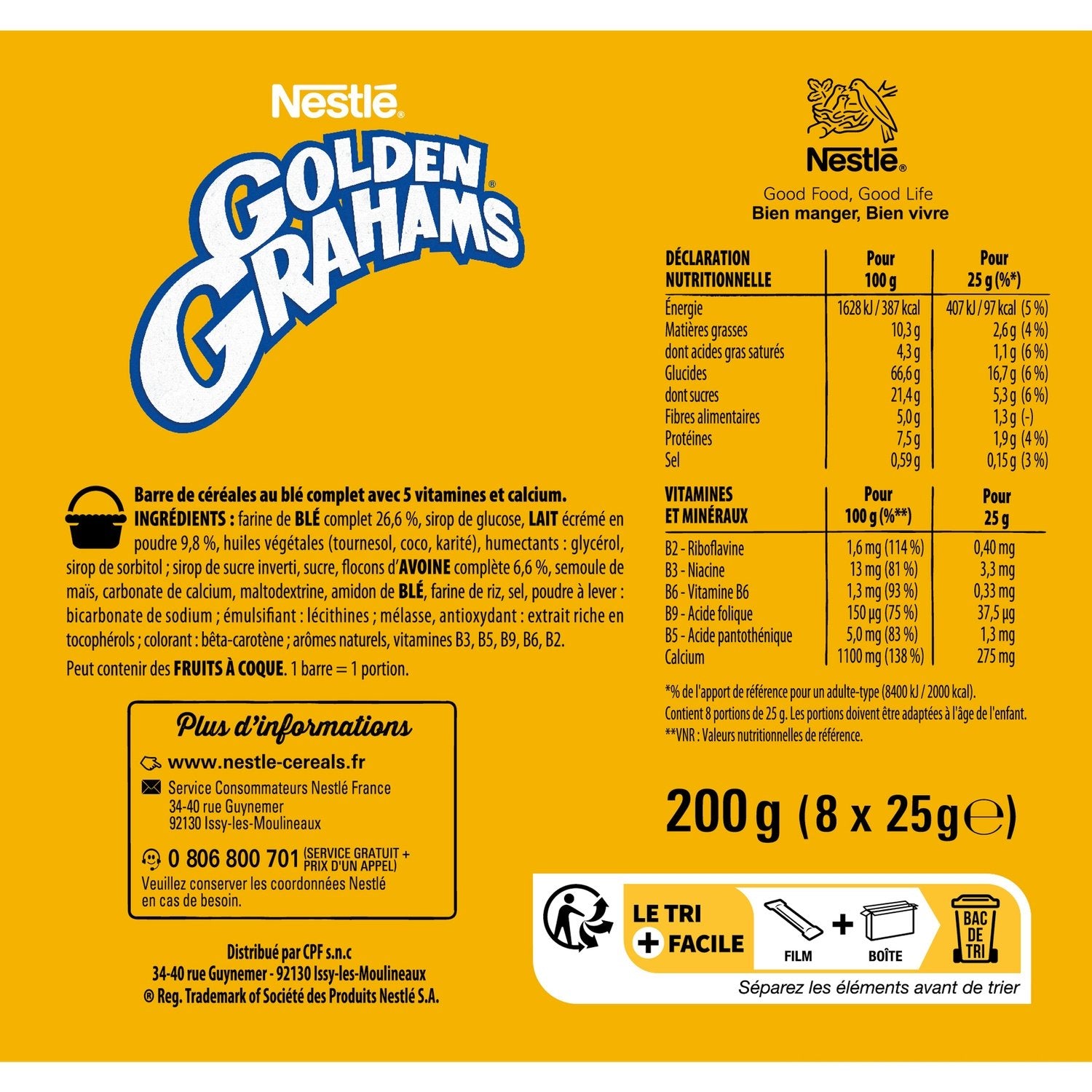Discover GOLDEN GRAHAMS® cereal bars in 8x25g packs, a delicious and crunchy cereal bar to take with you everywhere. Find these delicious little crunchy squares with the good taste of golden baked biscuits for breakfast or for a downright irresistible gourmet break! NESTLE® GOLDEN GRAHAMS® bars are enriched with 5 vitamins and calcium. They are a source of fiber and free from artificial flavors and colors. And for a variety of pleasures, discover NESQUIK®, LION® and CHOCAPIC® bars.