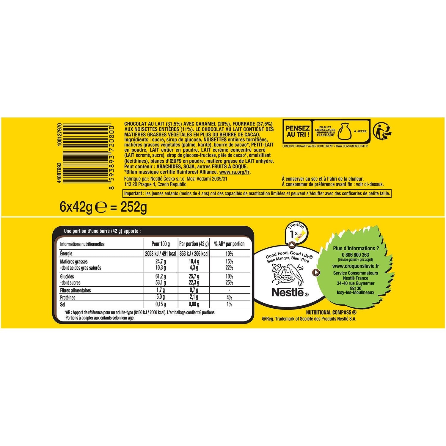 Fall for the delicious NUTS recipe, its crunchy whole hazelnuts and its delicious milk chocolate coating! NUTS is also a recipe made with simple ingredients, with natural flavors and aromas: a good milk chocolate and a soft nougat with natural vanilla extract. The reference portion is one NUTS bar.