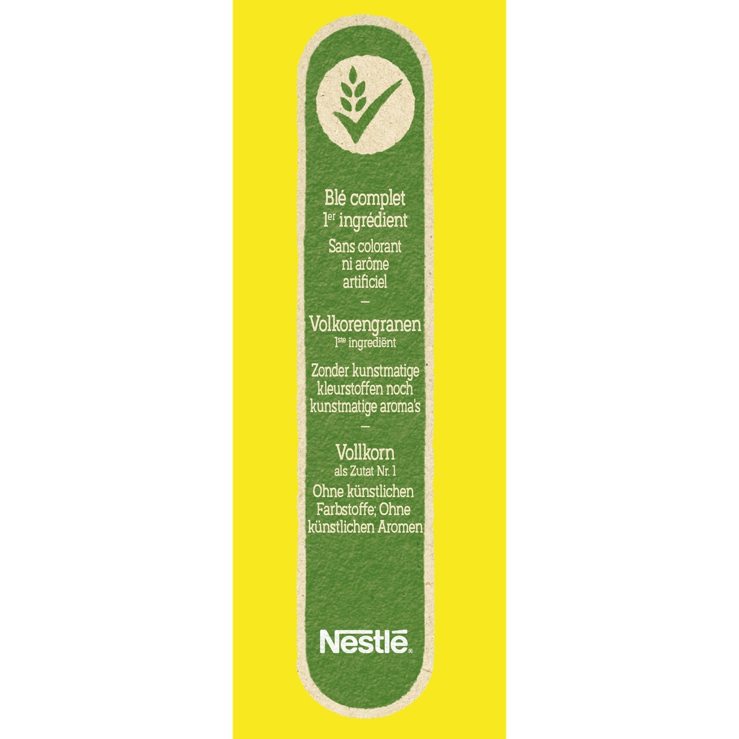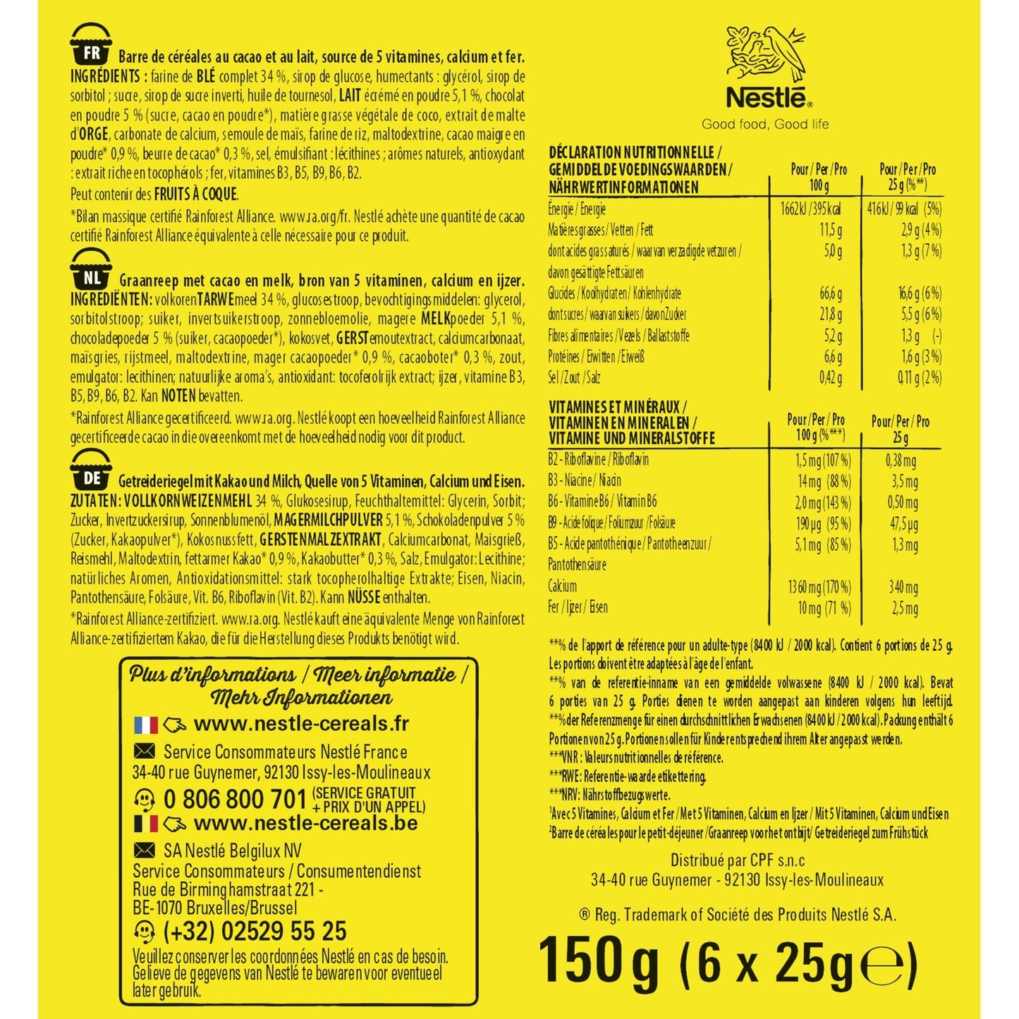 Ingredients: Whole Wheat flour 34%, glucose syrup, humectants: glycerol, sorbitol syrup; sugar, invert sugar syrup, sunflower oil, skimmed Milk powder 5.1%, chocolate powder 5.0% (sugar, cocoa powder*), vegetable coconut fat, BARLEY malt extract, calcium carbonate, corn semolina, rice flour, maltodextrin, fat-reduced cocoa* powder 0.9%, cocoa butter* 0.3%, salt, emulsifier: lecithins; natural flavorings, antioxidant: tocopherol-rich extract; iron, vitamins B3, B5, B9, B6, B2. May contain NUTS. * Rainforest Alliance certified mass balance www.ra.org/fr.